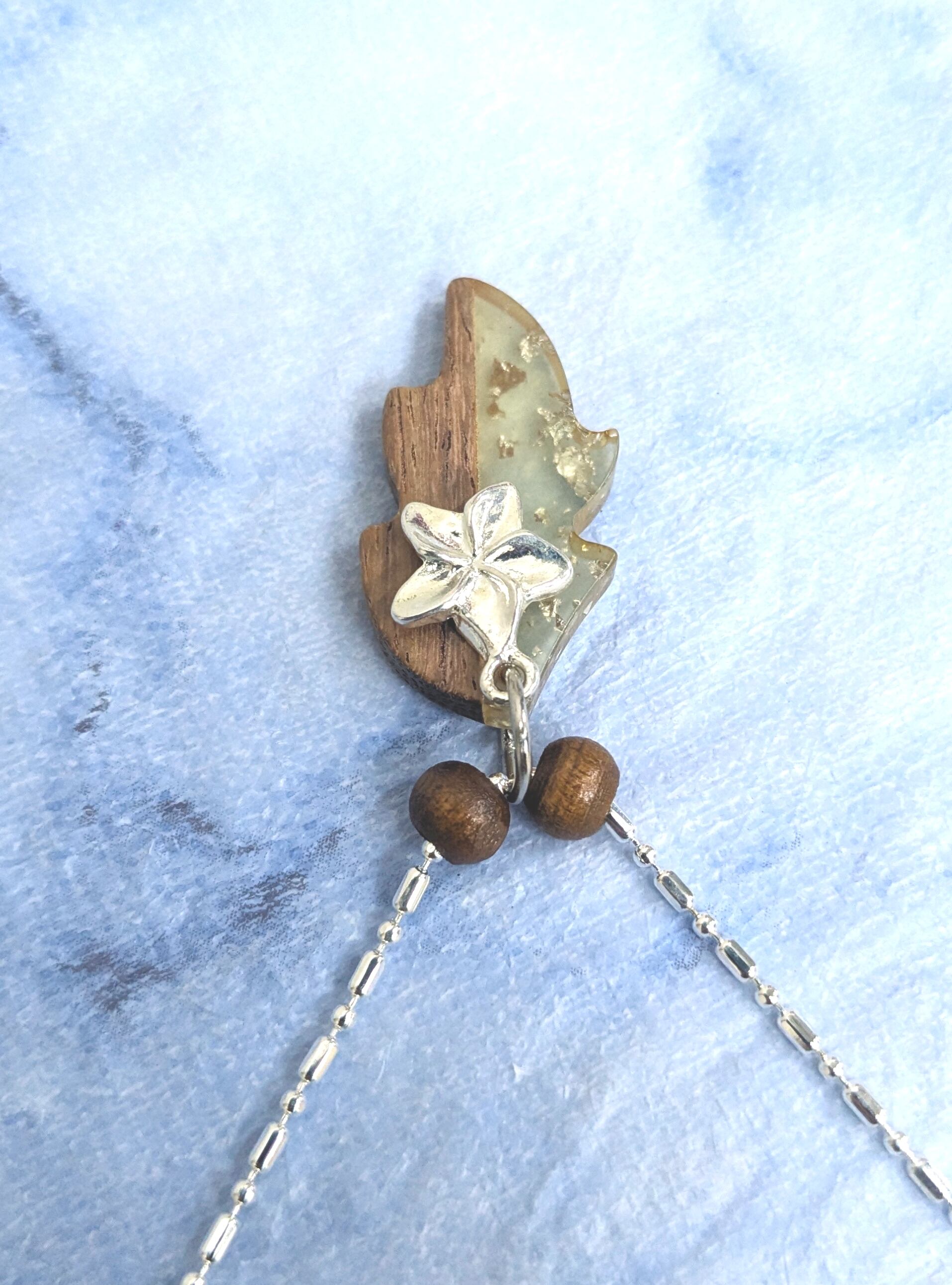 ハワイアンネックレス シルバープルメリア&天然ウッド クリアレジン デザインリーフ P-698