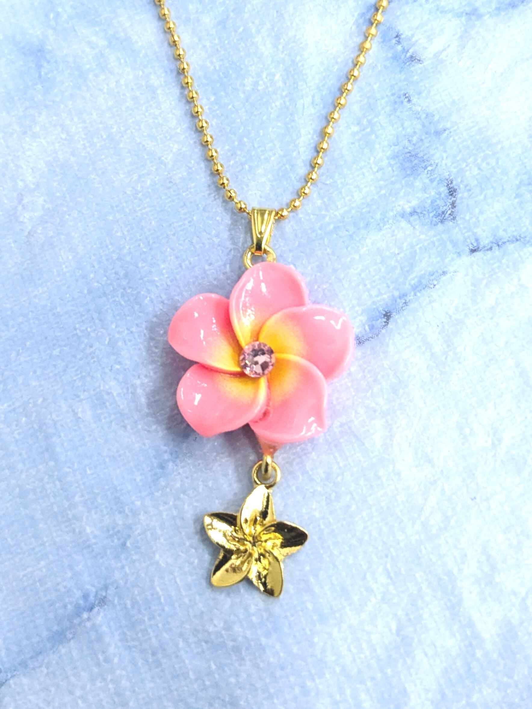 ハワイアンネックレス ピンク&イエロープルメリア &ゴールド 2連プルメリア P-700