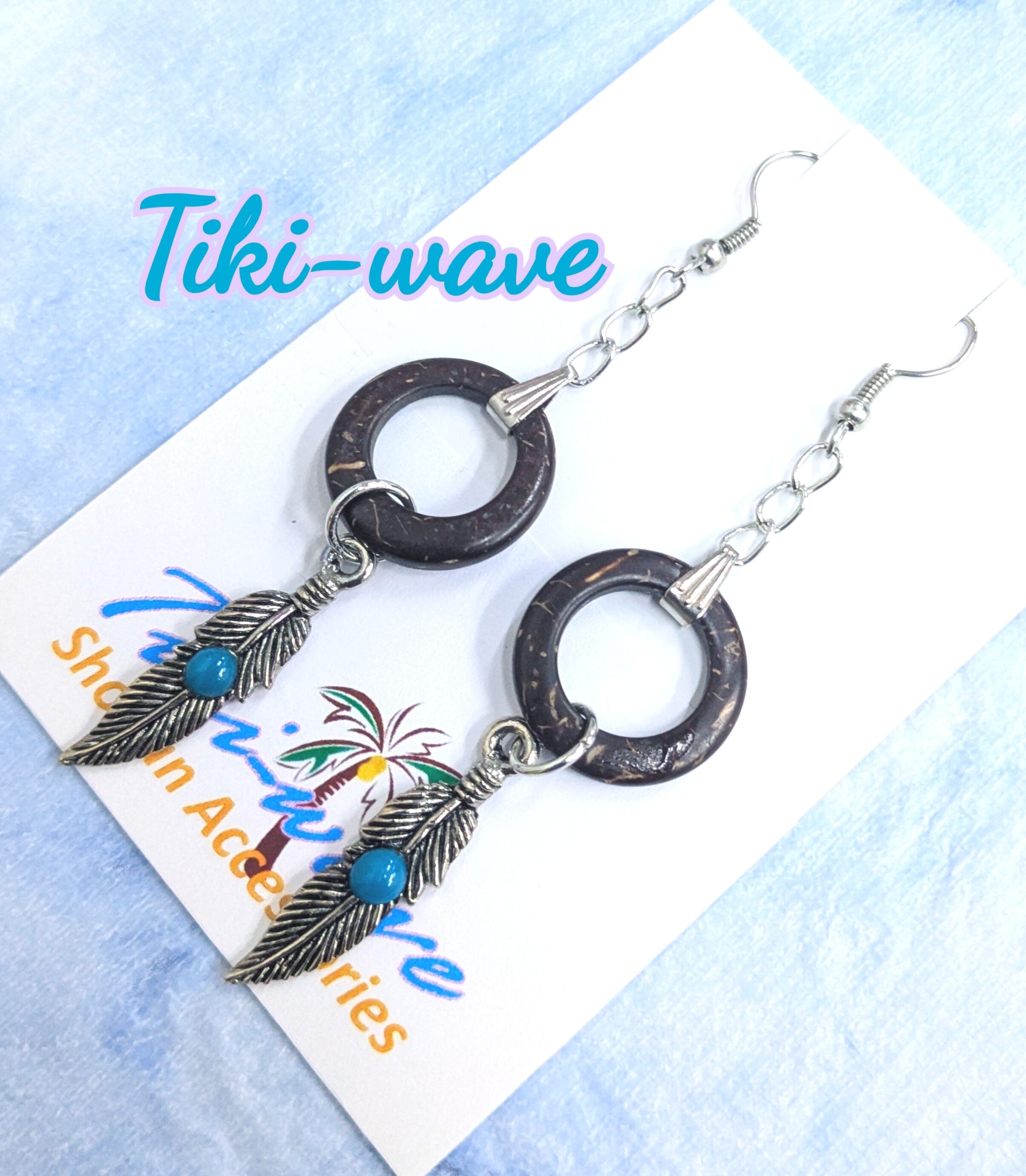 ハワイアンピアス 椰子サークルウッド& ターコイズ付きフェザー A-246
