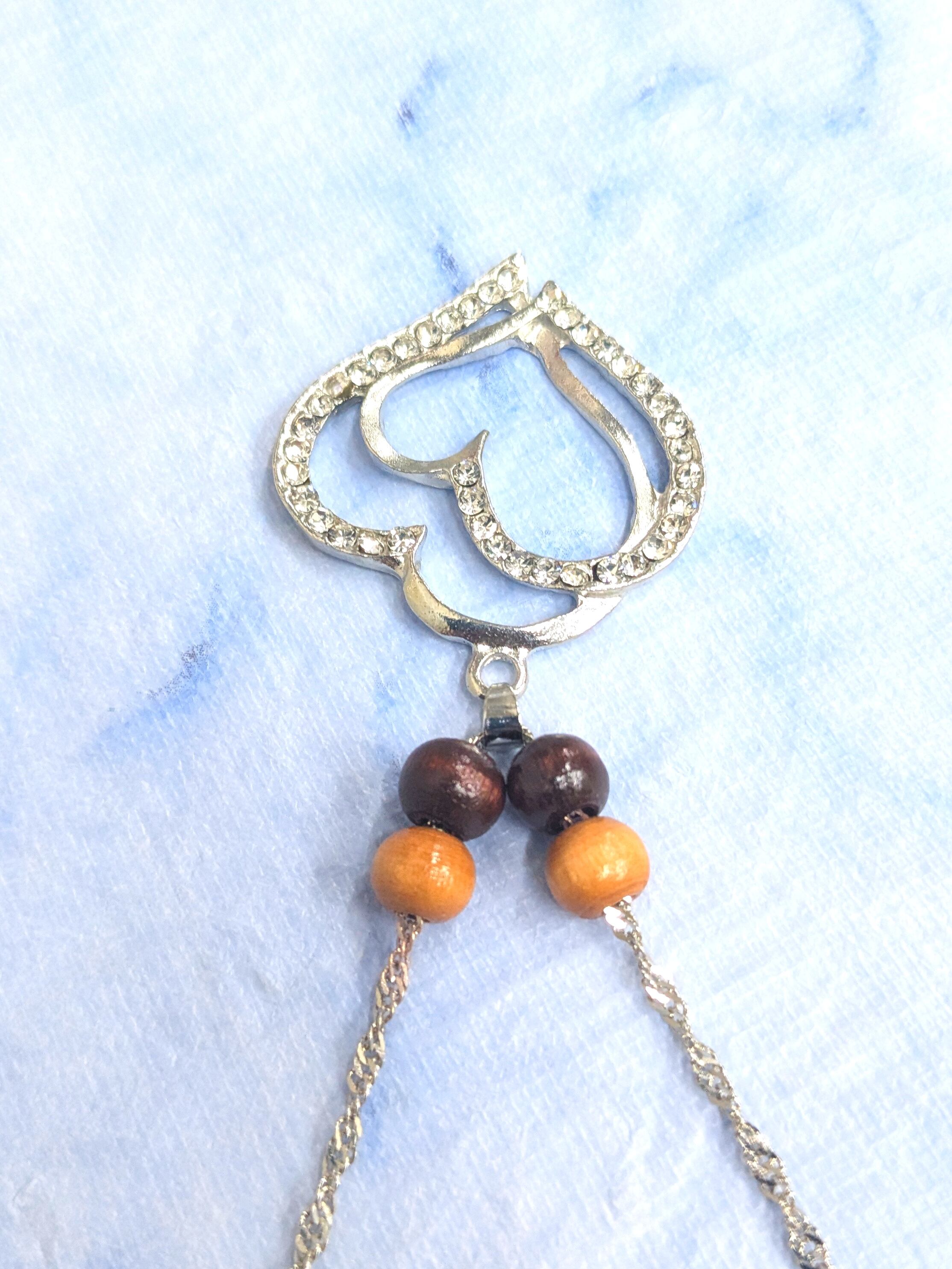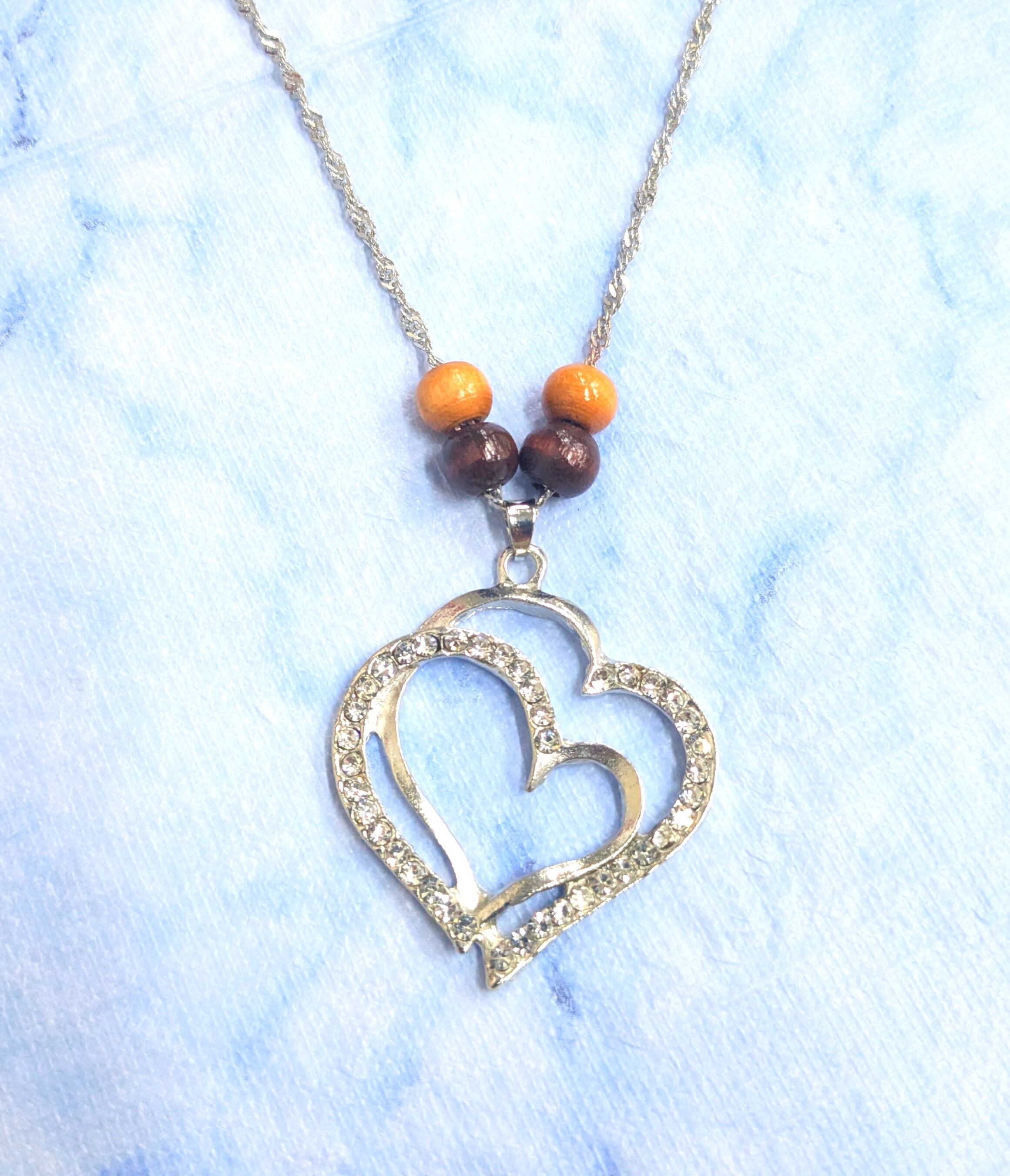 ハワイアンネックレス シルバーカラー Wハート&CZ ウッドビーズ L-627
