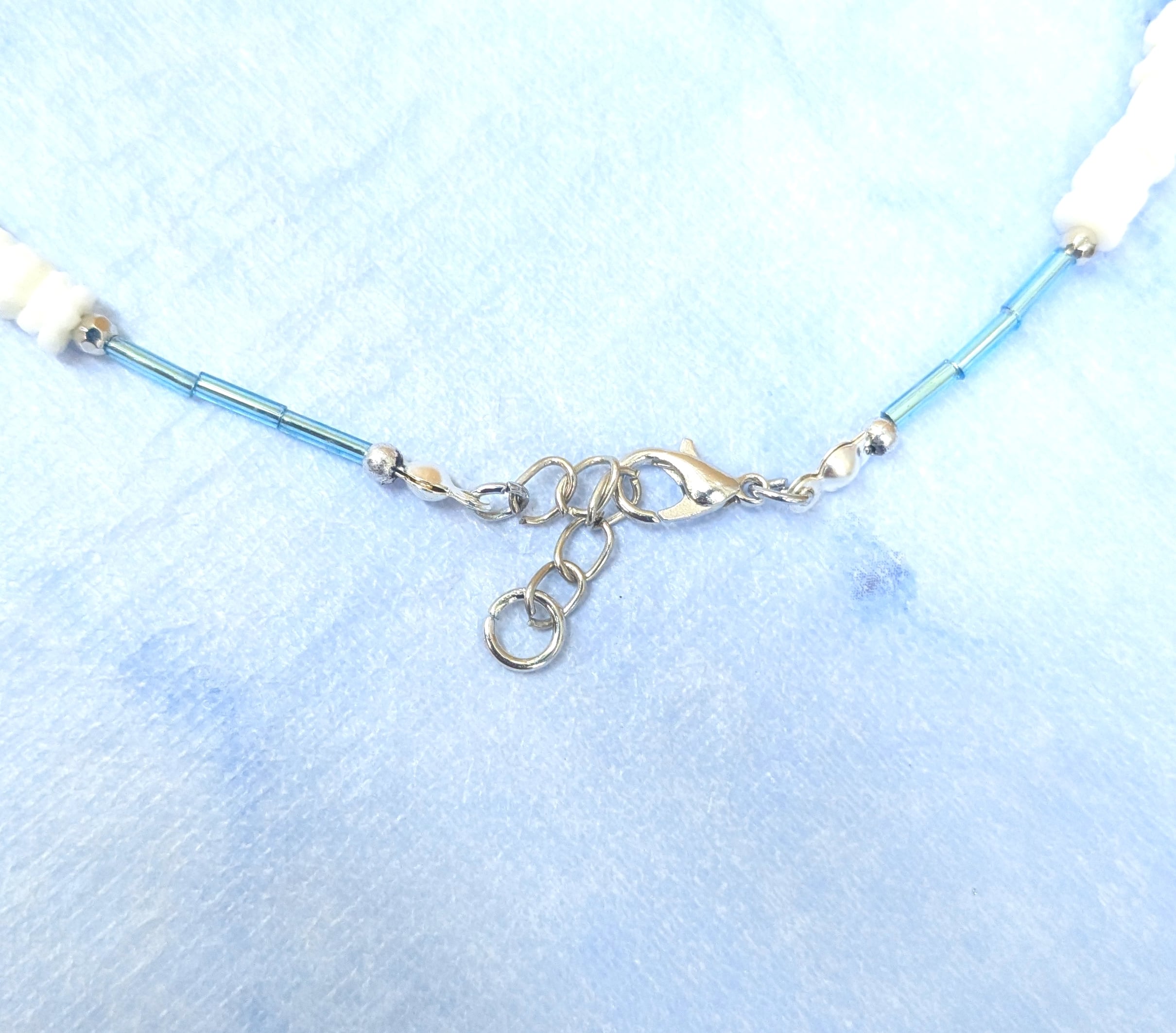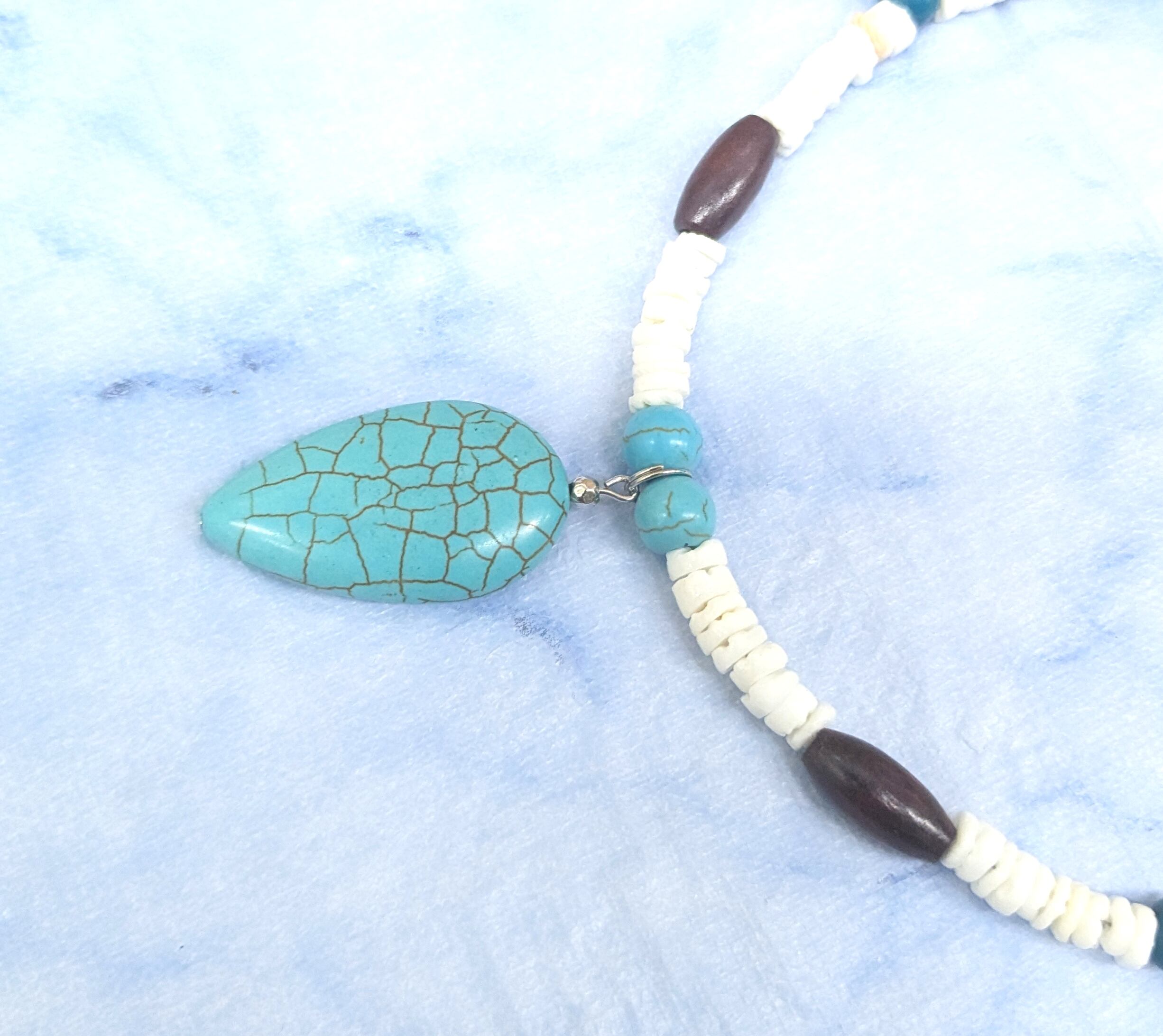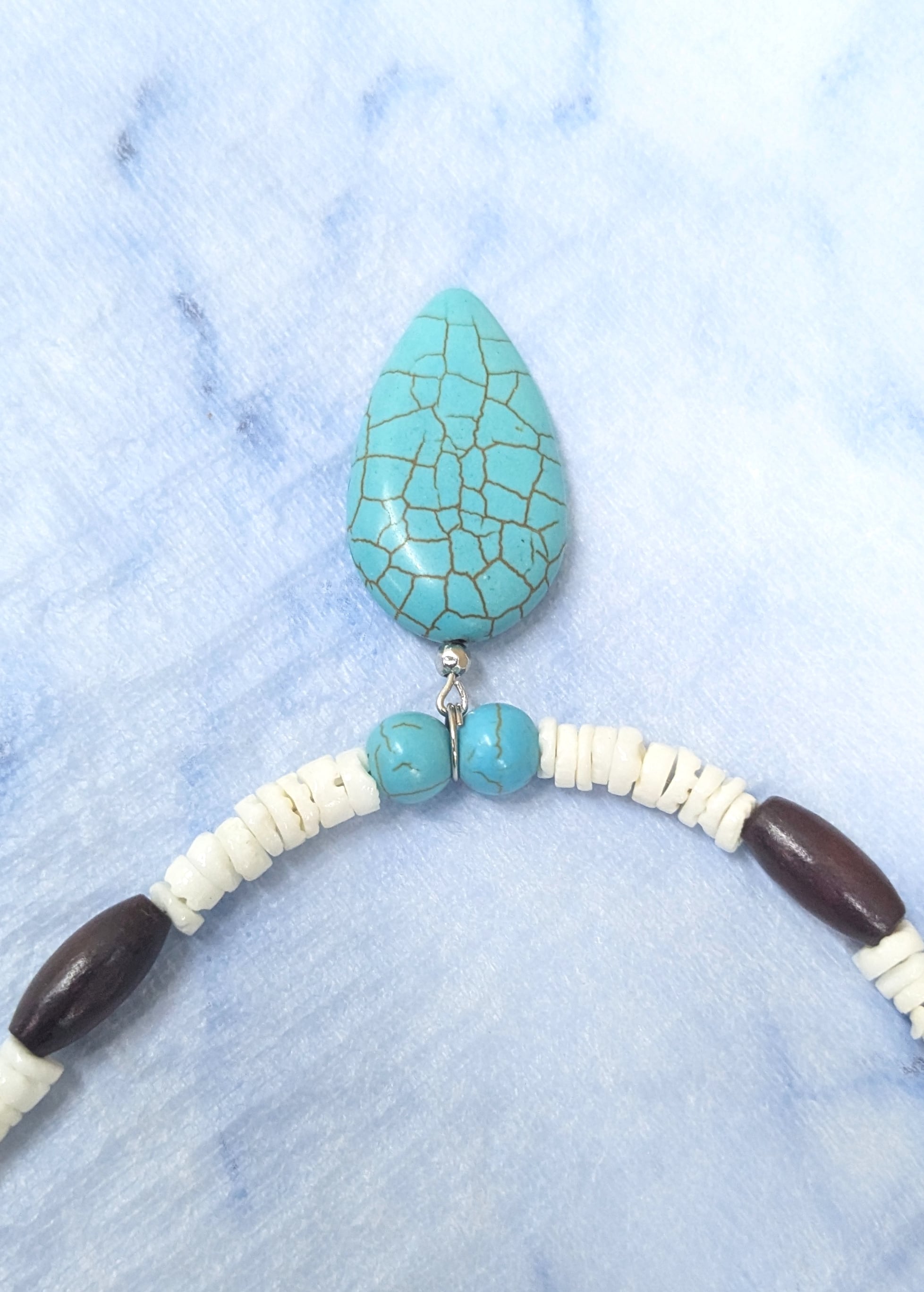 メンズネックレス ブルーカラー ティアドロップ ターコイズ & ホワイトシェルビーズ T-945
