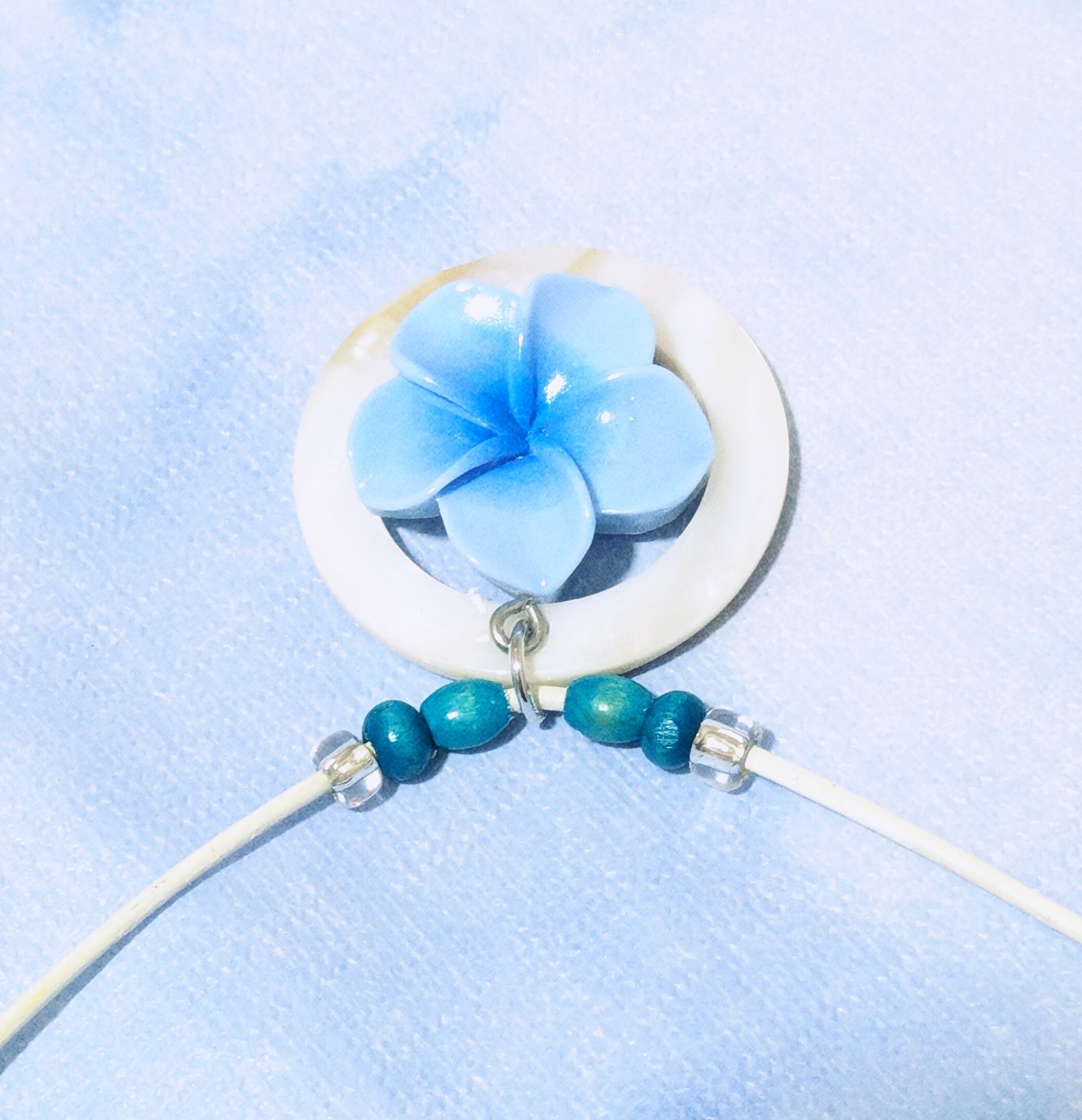 ハワイアンネックレス ホワイトサークルシェル &ライトブループルメリア P-711