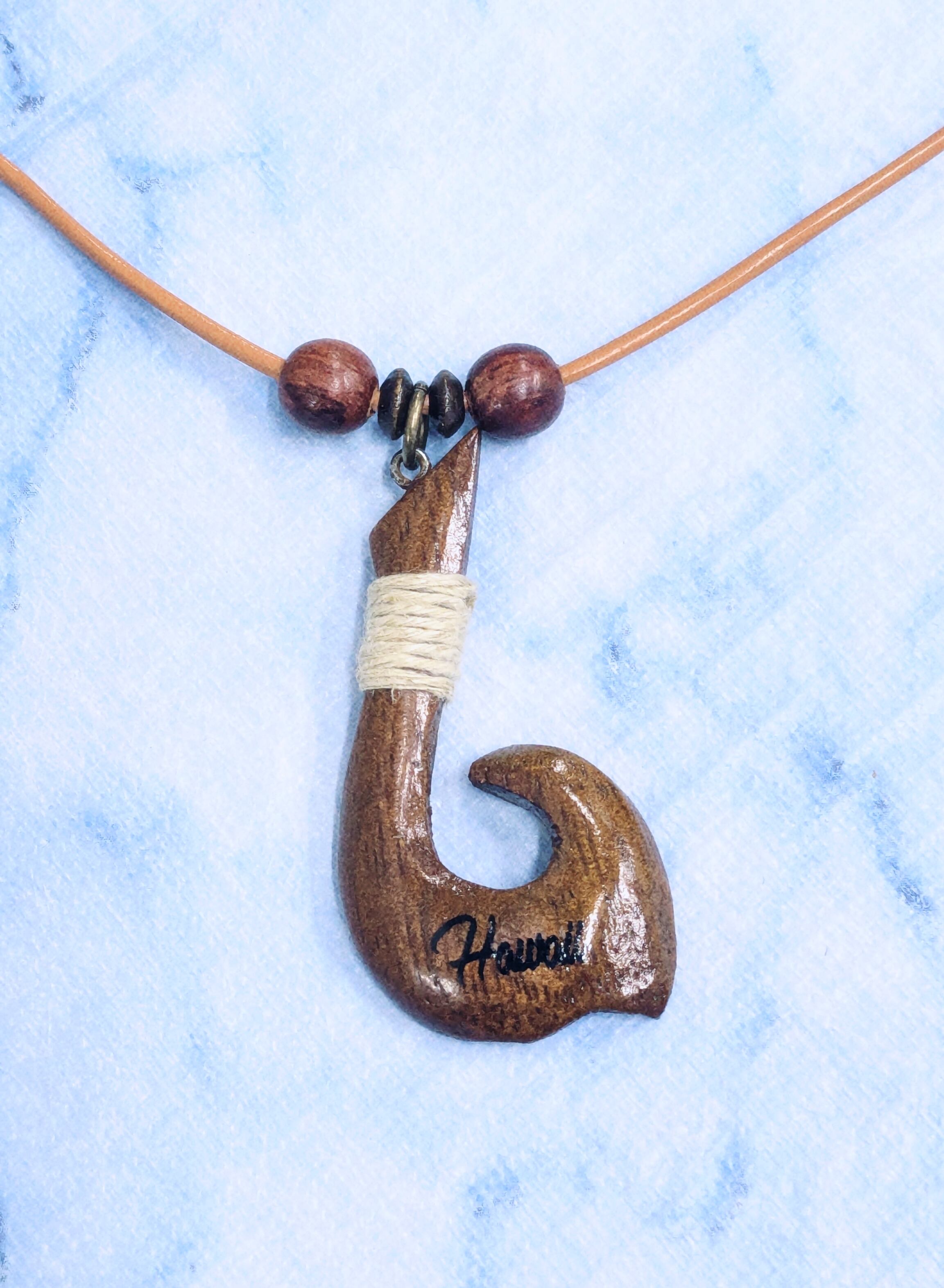 ハワイアンネックレス ハワイアンウッド 麻紐巻き フィッシュフック ブラウンカラー F-136