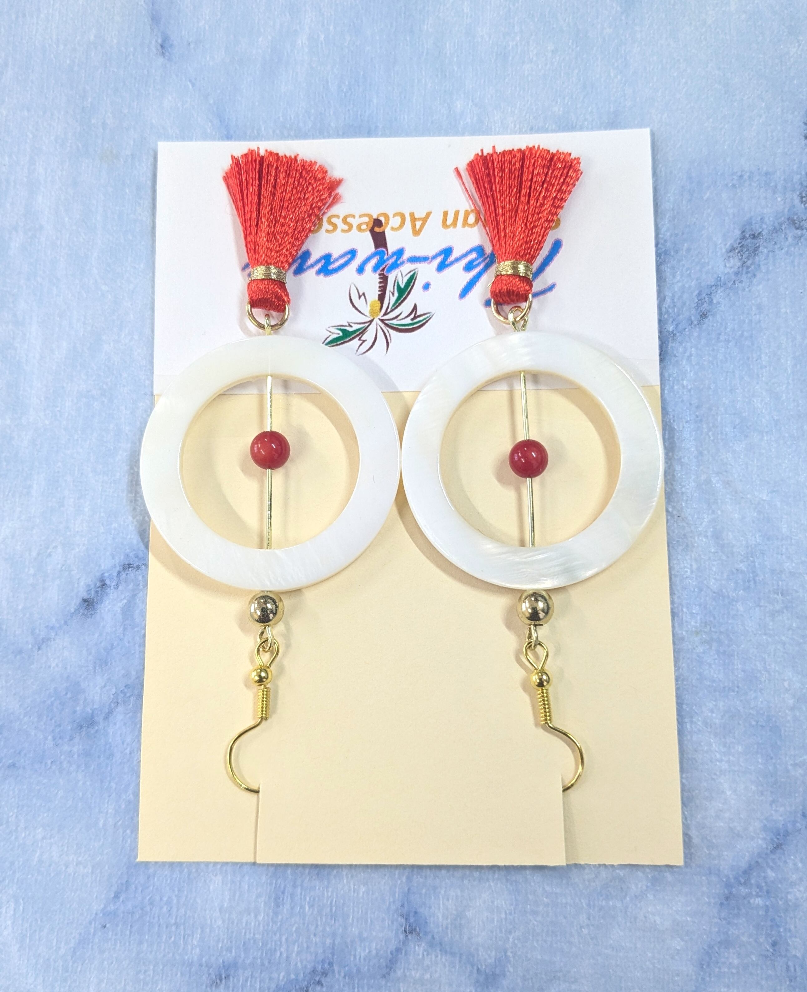 ファッションピアス ホワイトサークルシェル & レッドフリンジ A-399