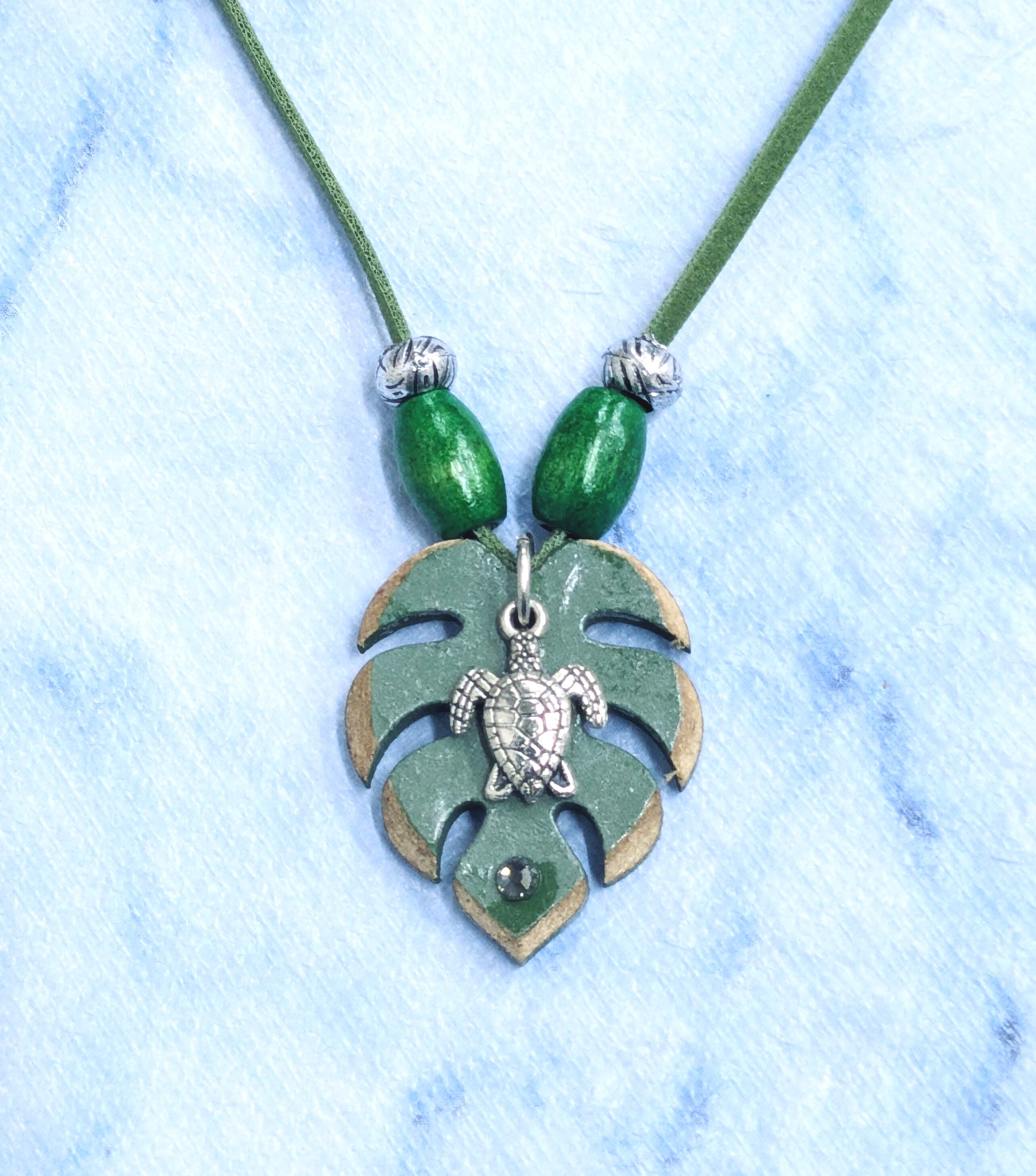 ハワイアンネックレス グリーンカラー天然ウッド モンステラ & シルバーカラーホヌ M-543
