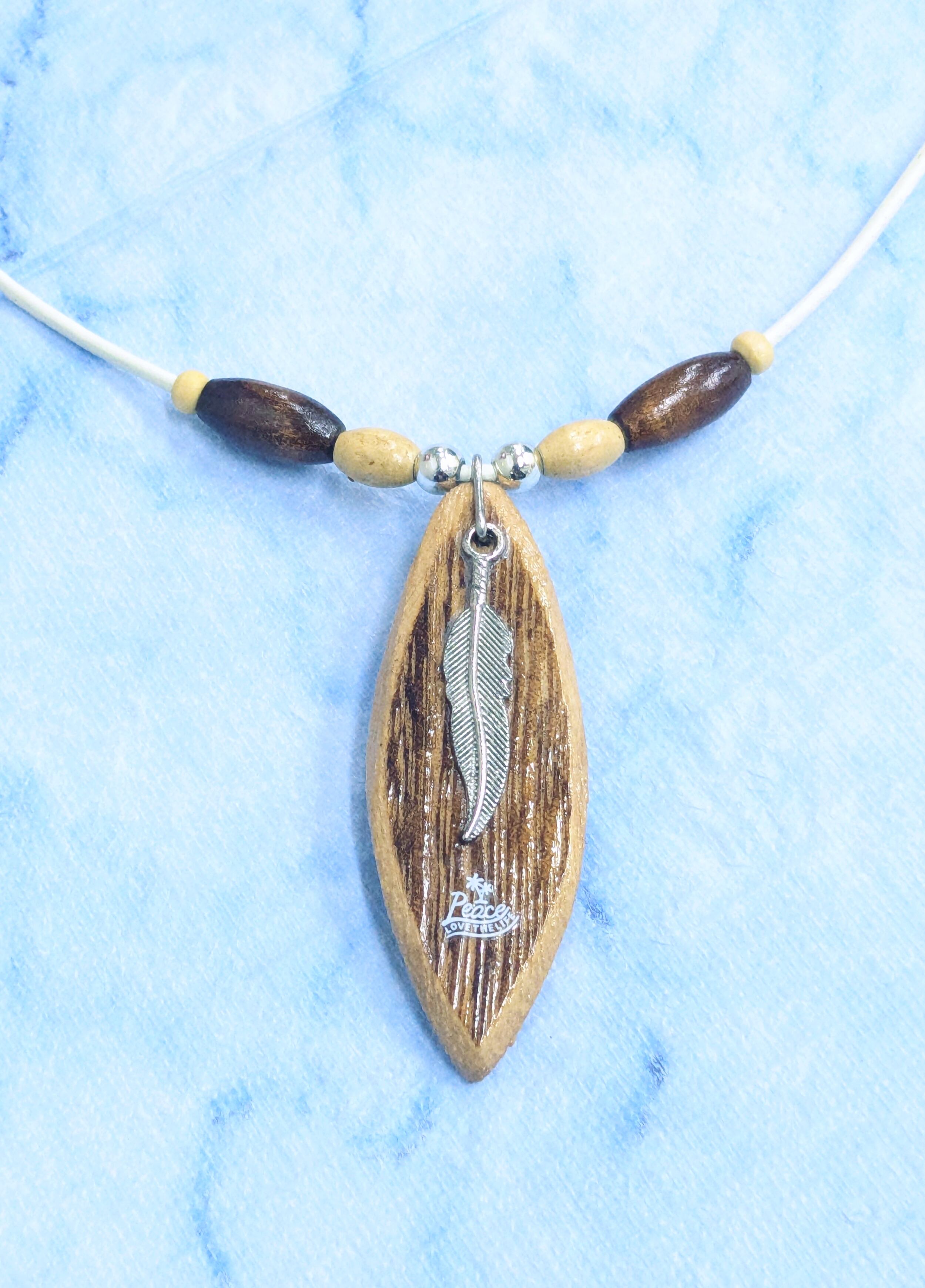 ハワイアンネックレス 天然ウッドサーフボード & シルバーフェザー 本革紐 B-401