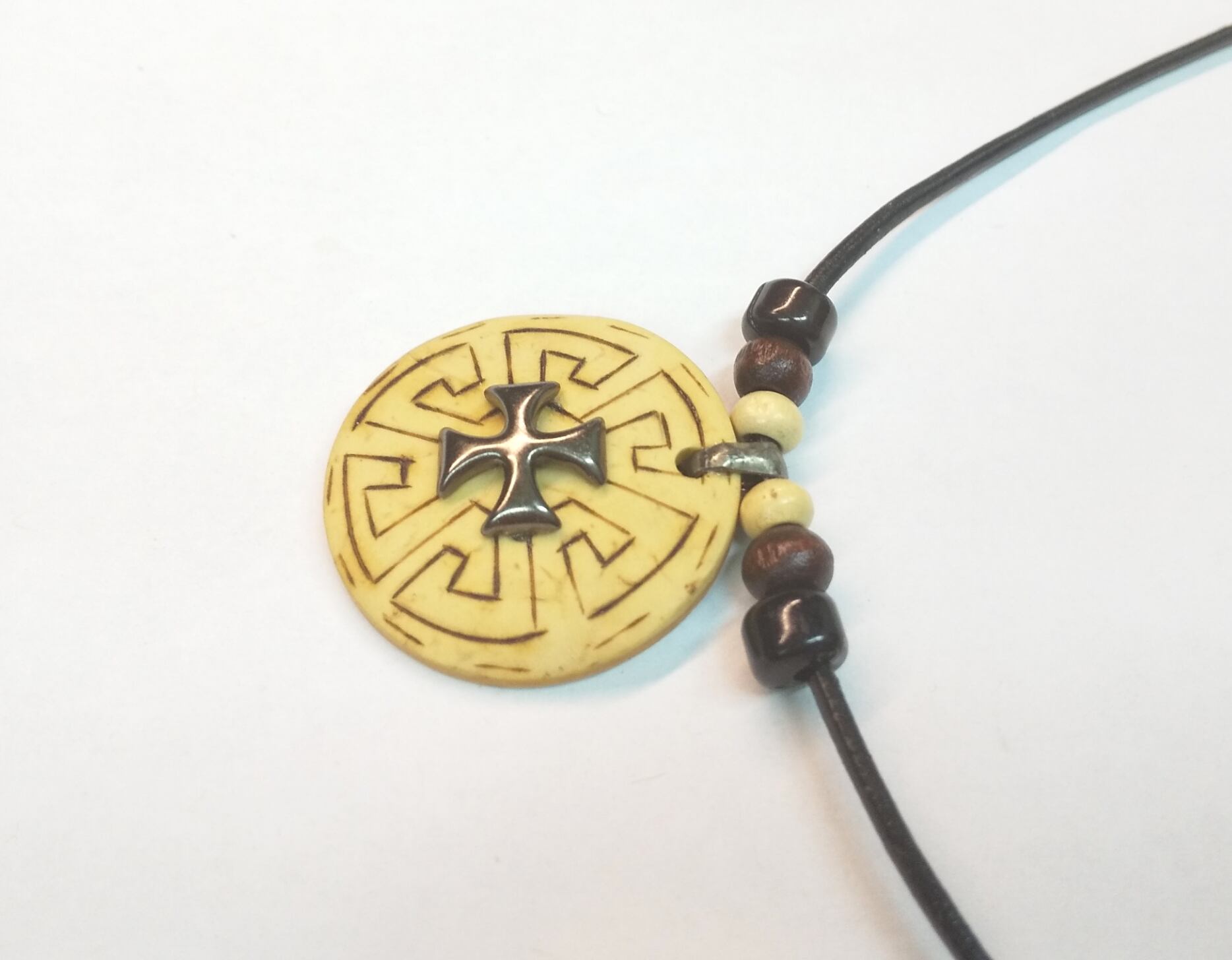 メンズネックレス 天然ウッド&ジャーマンクロス 本革紐 U-536