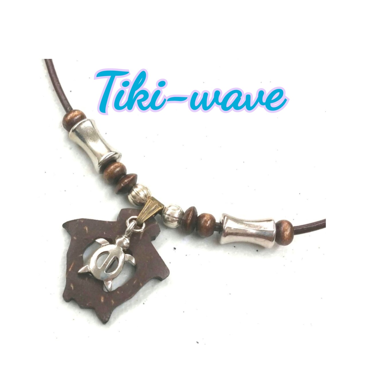 ハワイアンネックレス 椰子ウッド&シルバー2連ホヌ 本革紐 Y-104