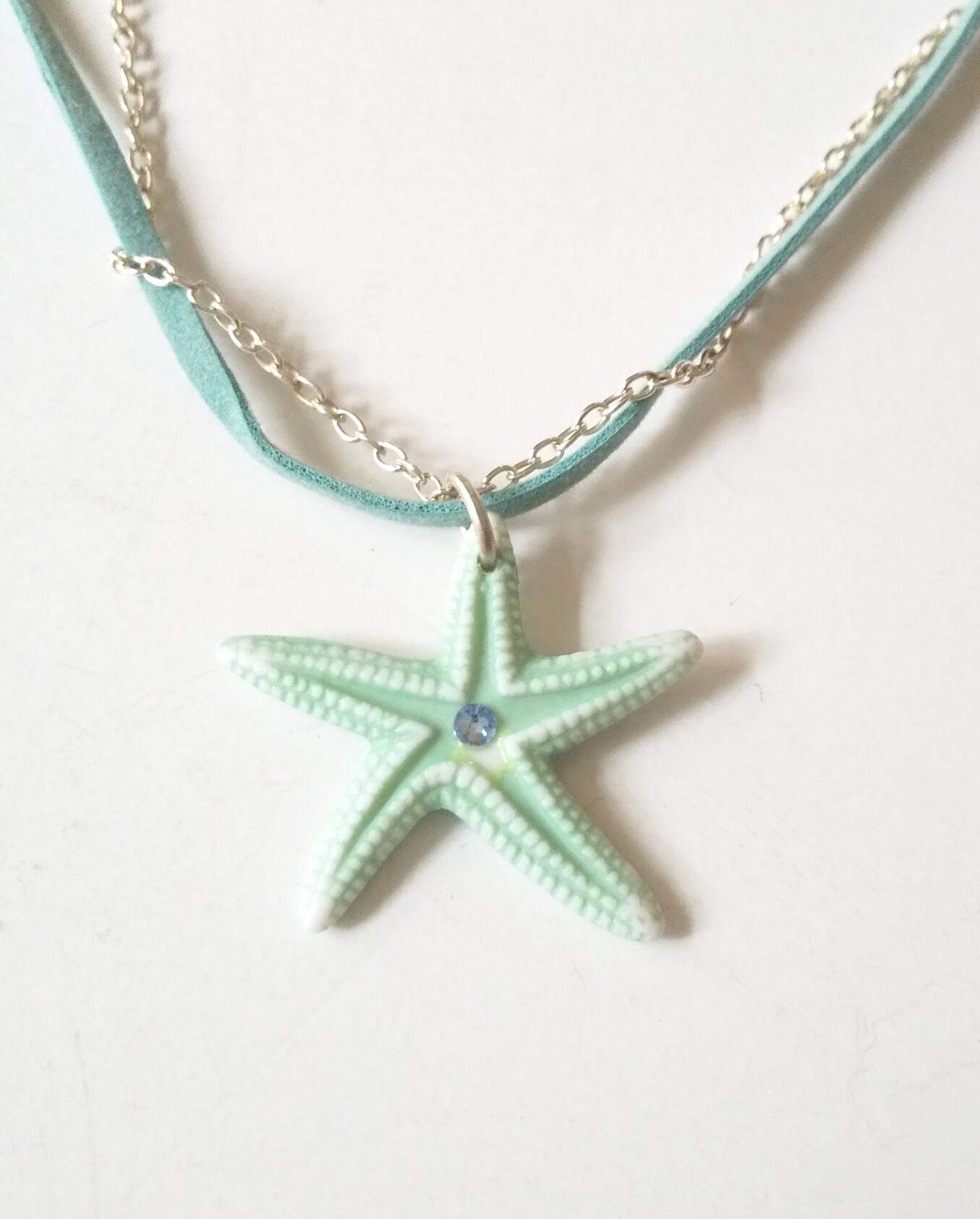 ハワイアンネックレス ミントカラー スターフィッシュ&スエード紐 M-104