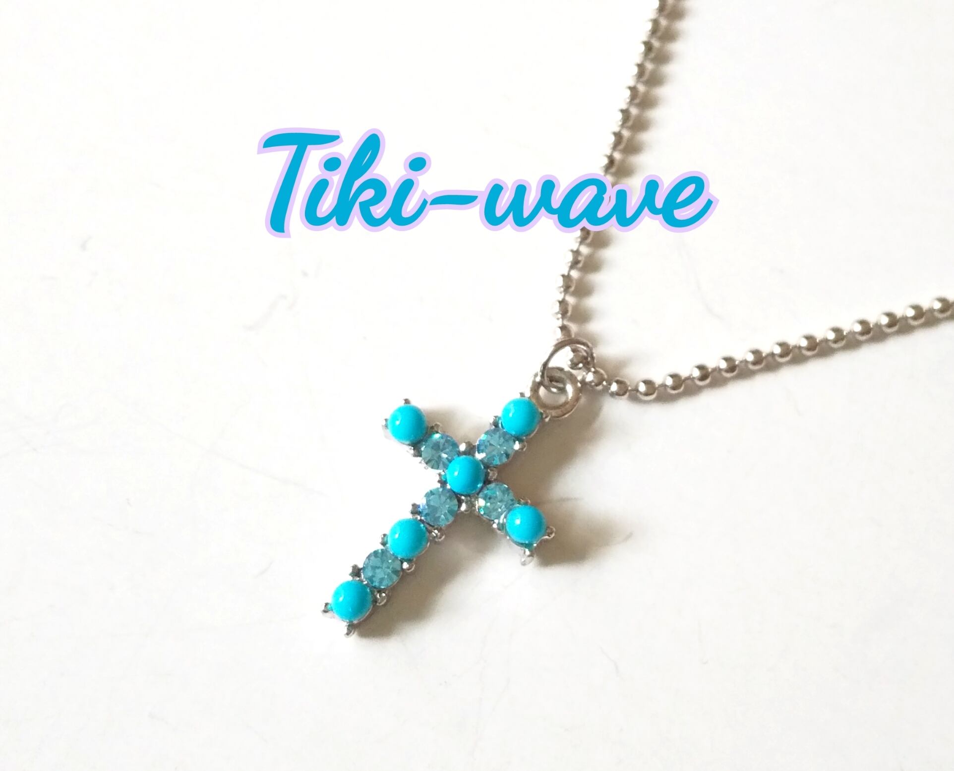 レディースネックレス シルバーカラー クロス アクアブルーCZ L-808