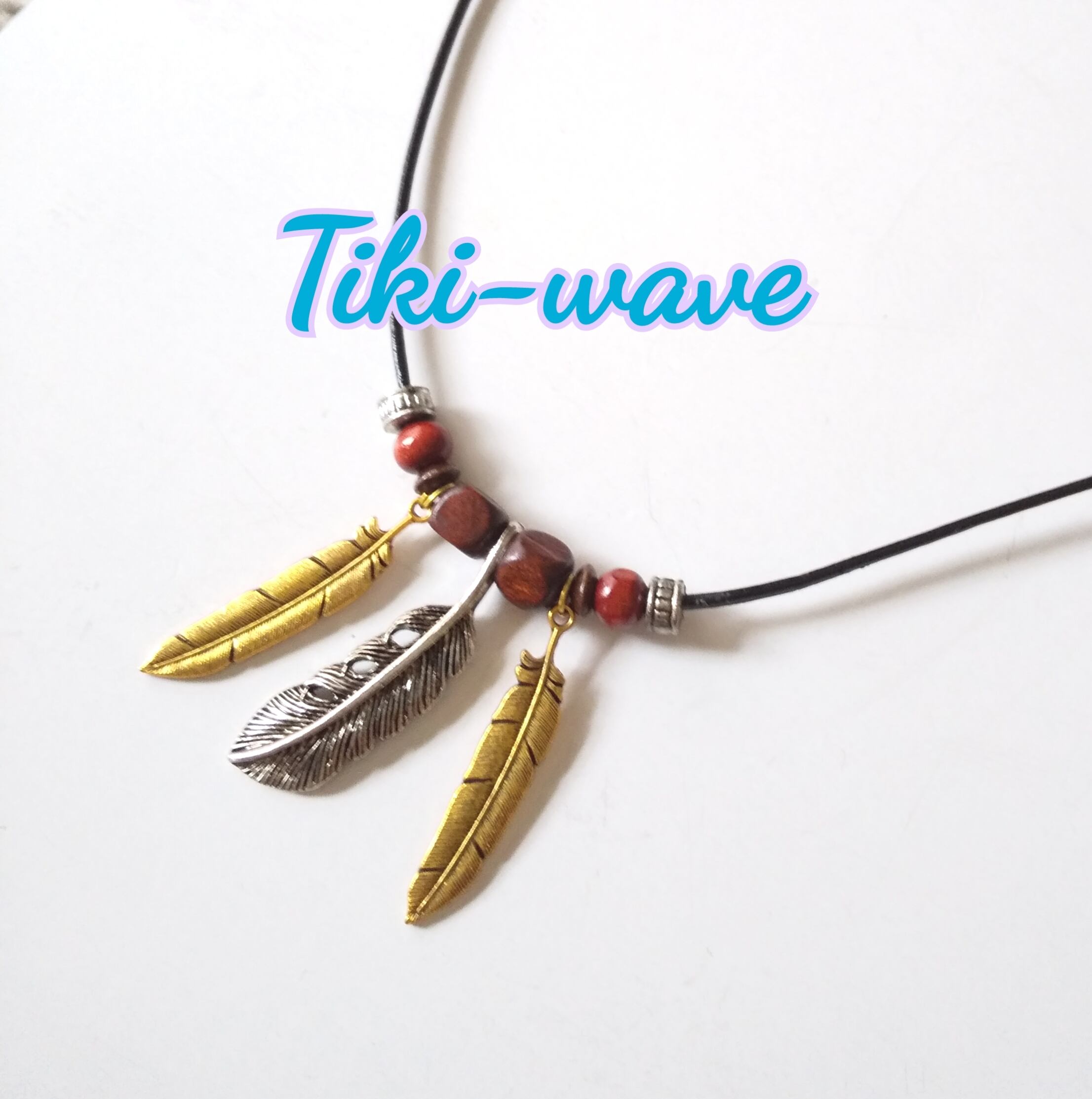 メンズネックレス シルバー&ゴールドカラー 3連フェザー 本革紐 Y-503