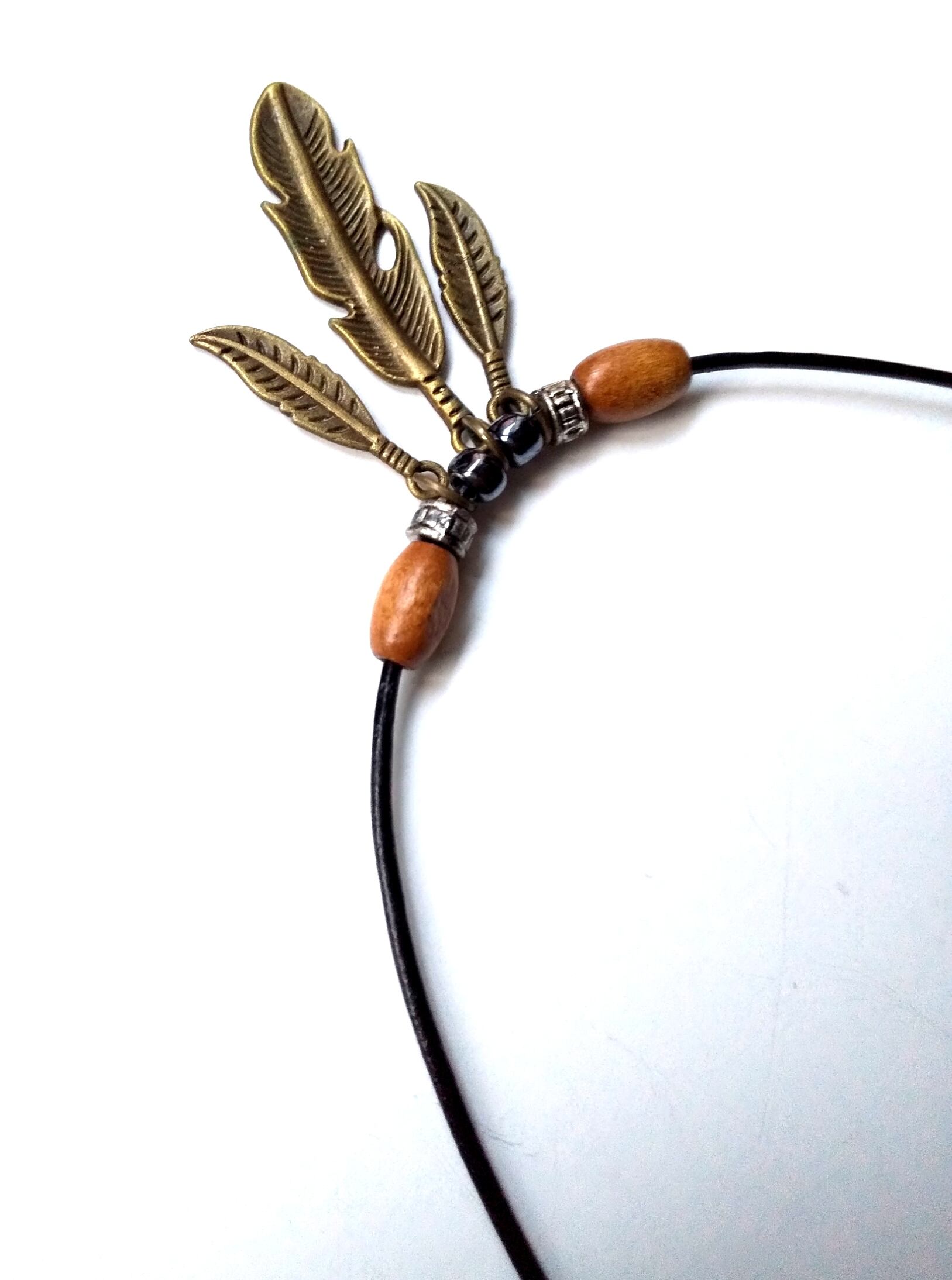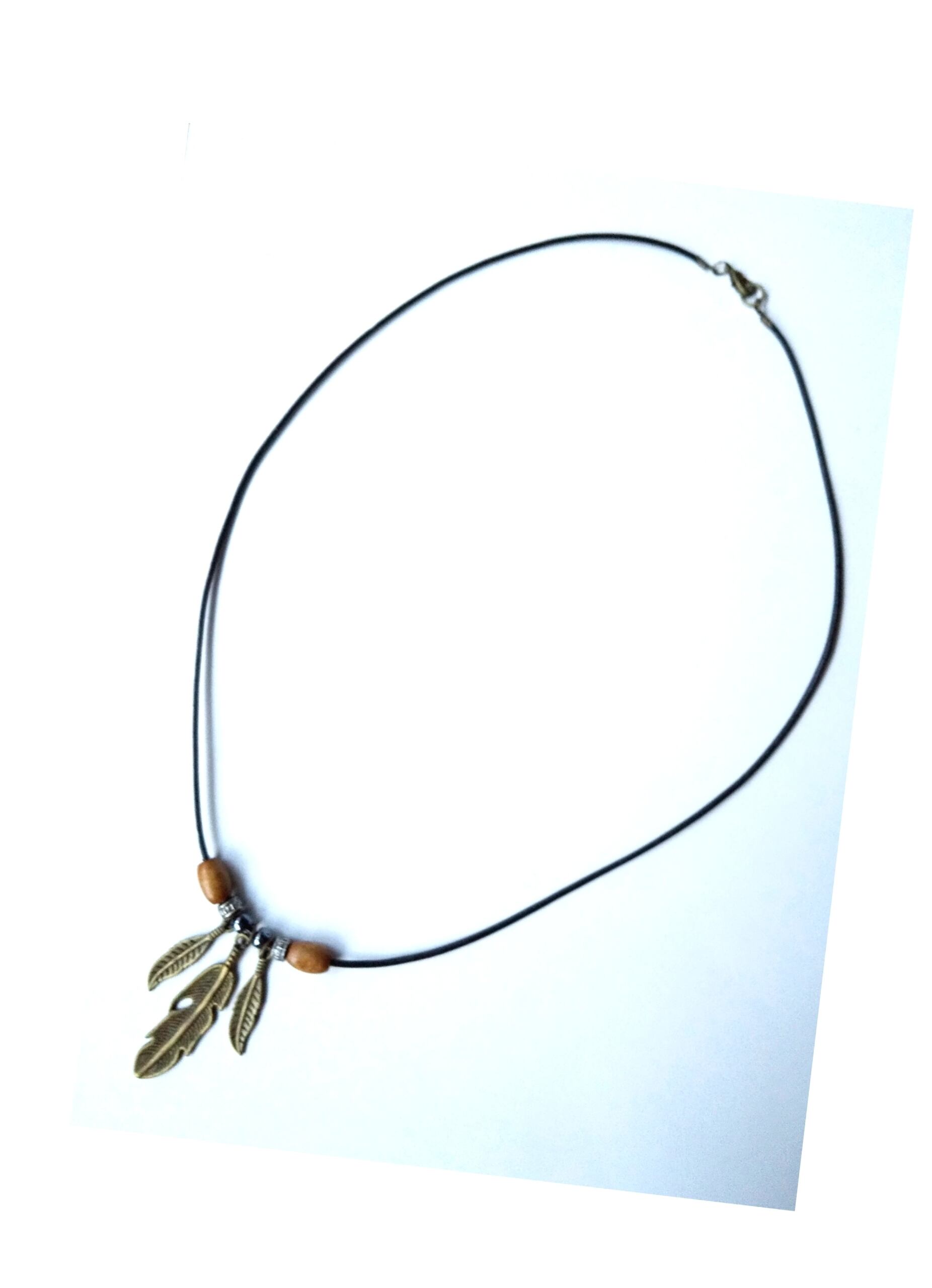 メンズネックレス 金古美カラー 3連フェザー 本革紐 Y-504