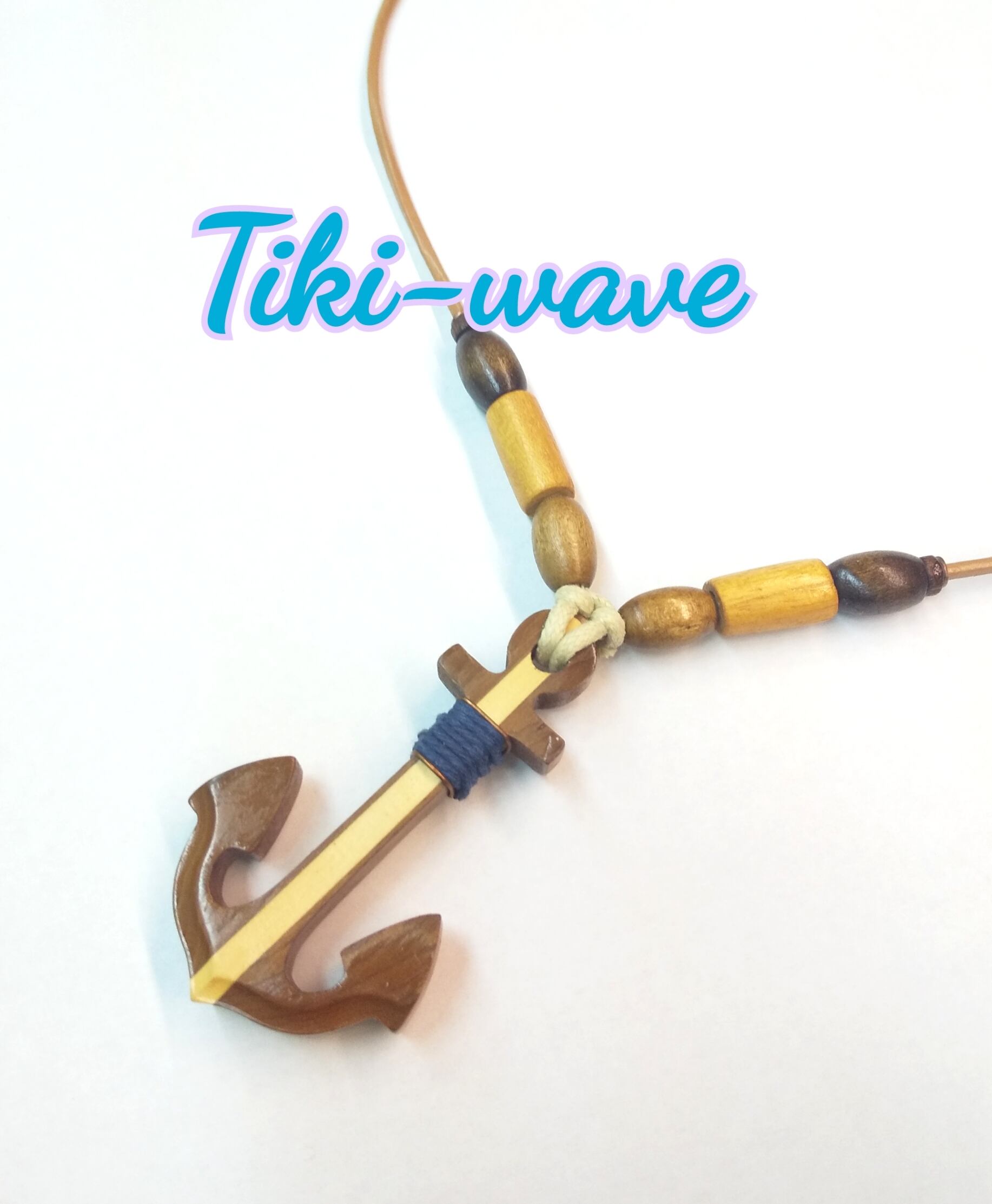 メンズネックレス 天然ウッド製あブラウンカラー アンカー 碇&本革紐 Y-454