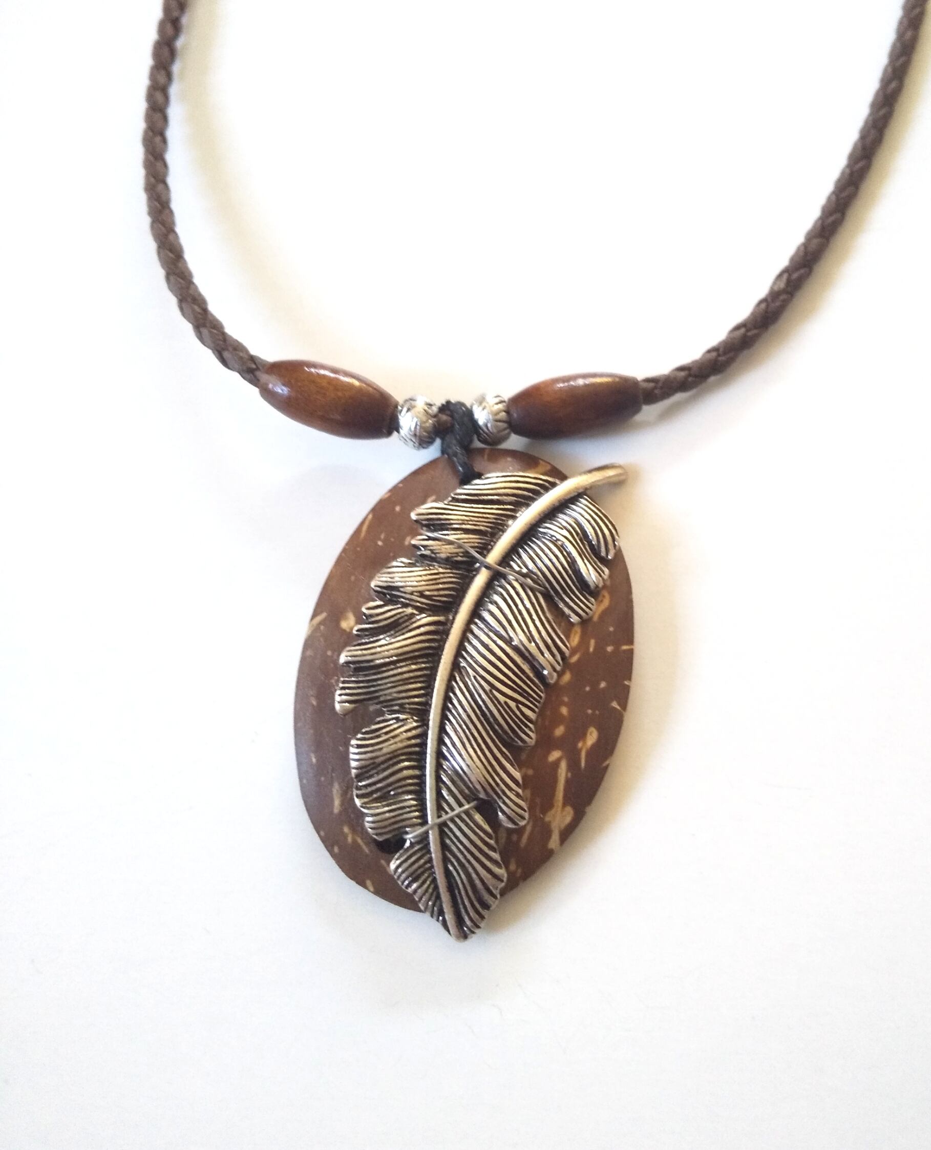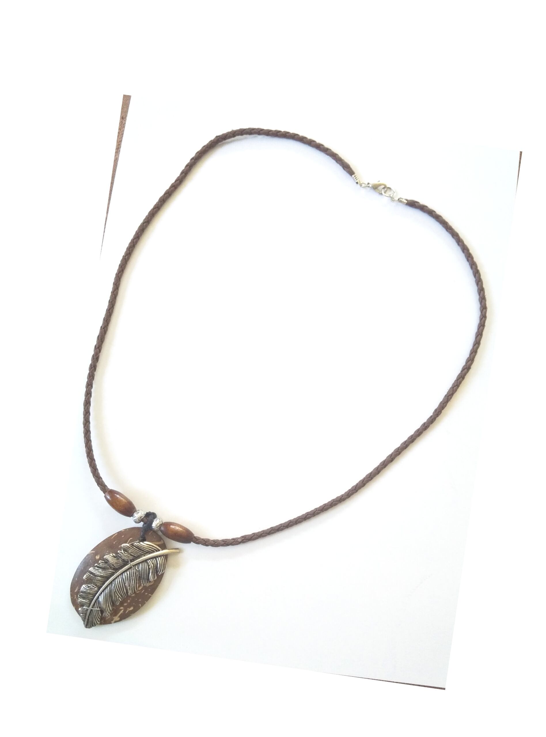 メンズネックレス Bigサイズ シルバーカラー フェザー &椰子ウッド Y-508