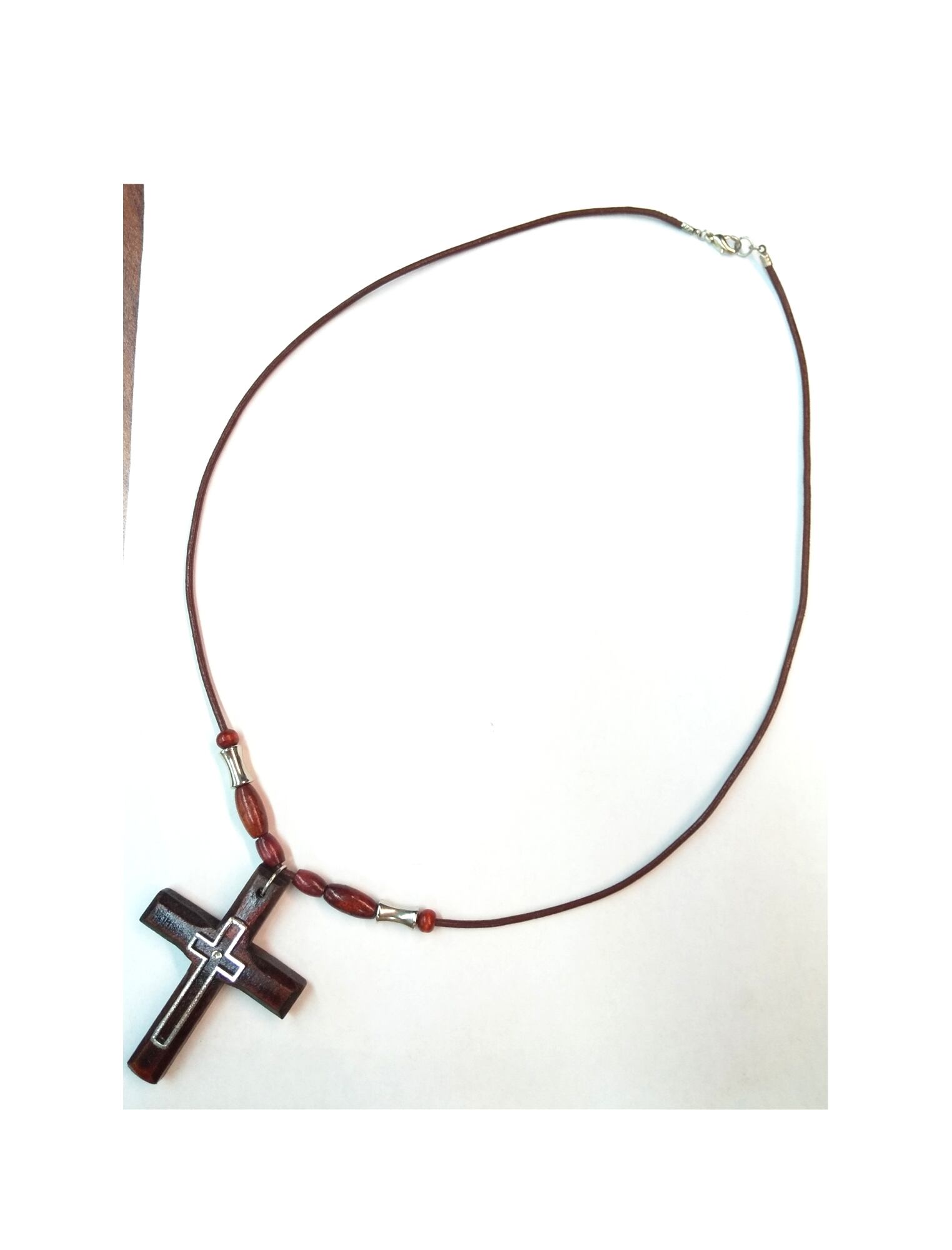 メンズネックレス 天然ウッドビッグクロス& ワインブラウン本革紐 Y-654