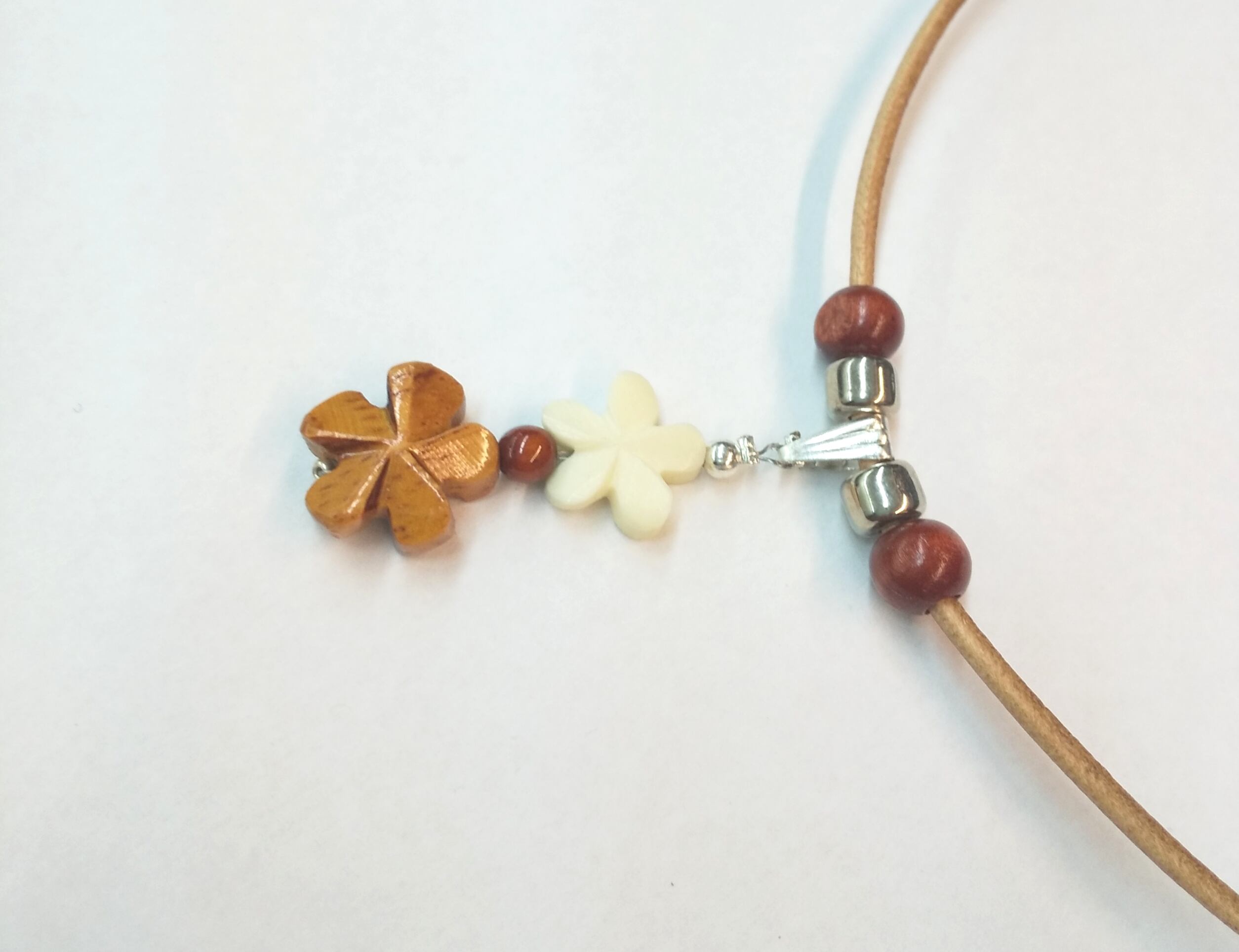 ハワイアンネックレス 2連プルメリア ウッド& ホワイトボーン 本革紐 P-619