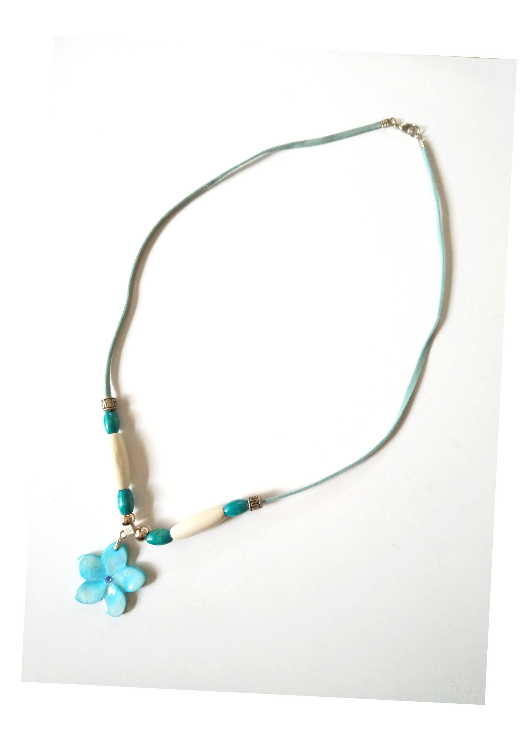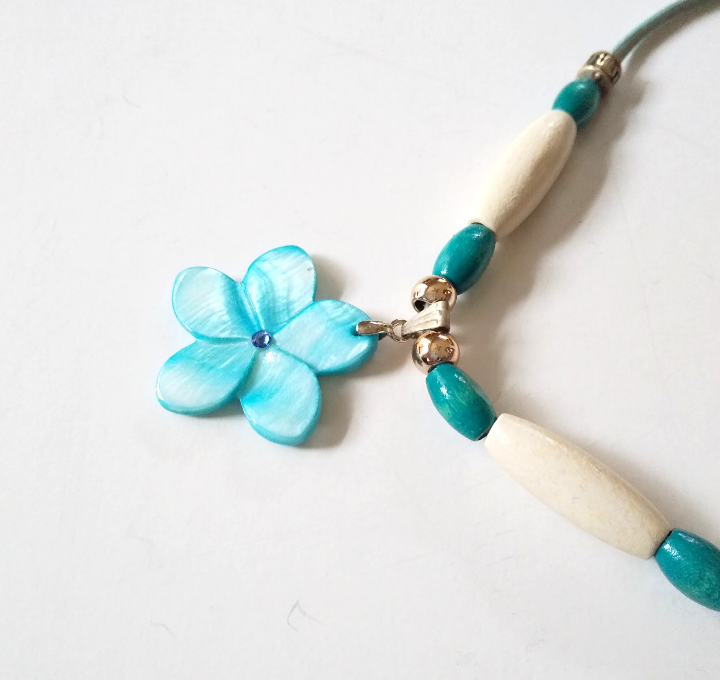 ハワイアンネックレス 天然シェル ブループルメリア &アクアCZ粒 P-627