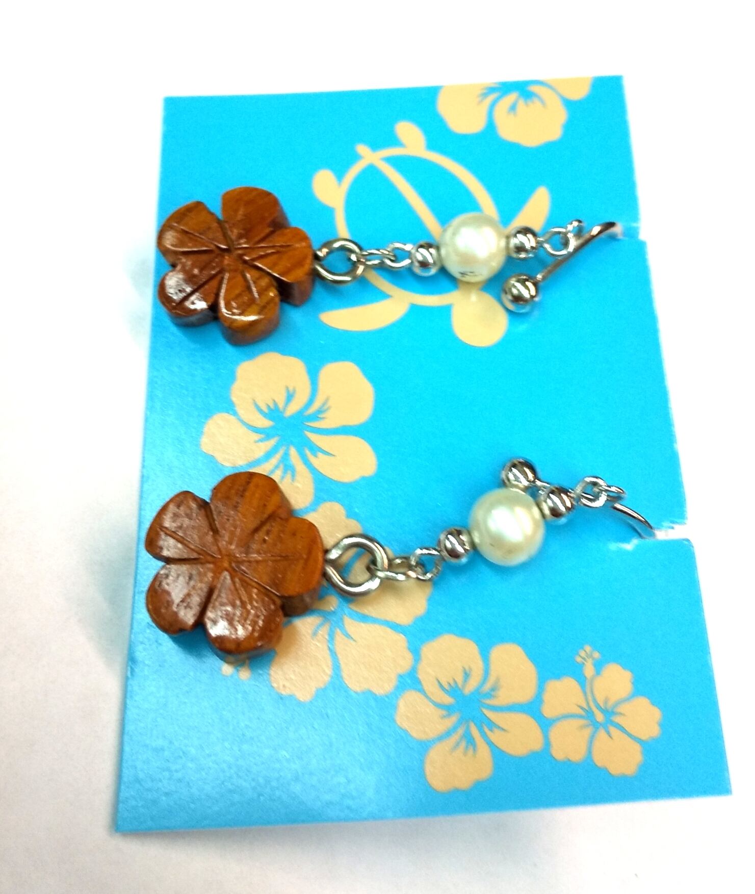 ハワイアクセサリー 天然ウッド プルメリア& パール イヤリング A-112