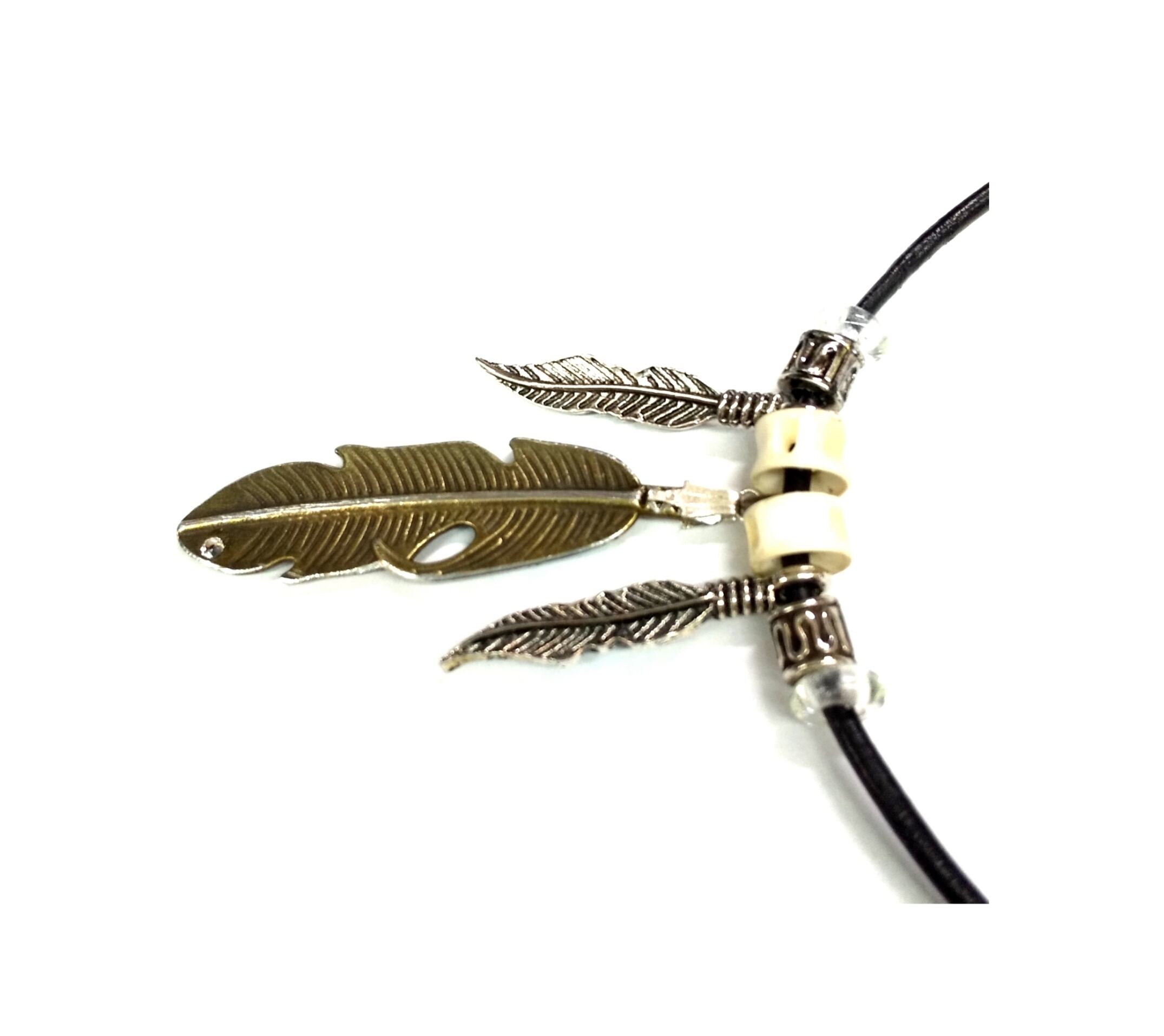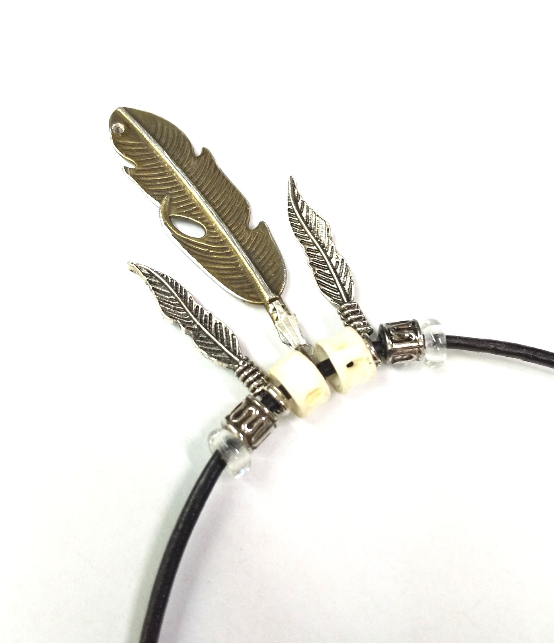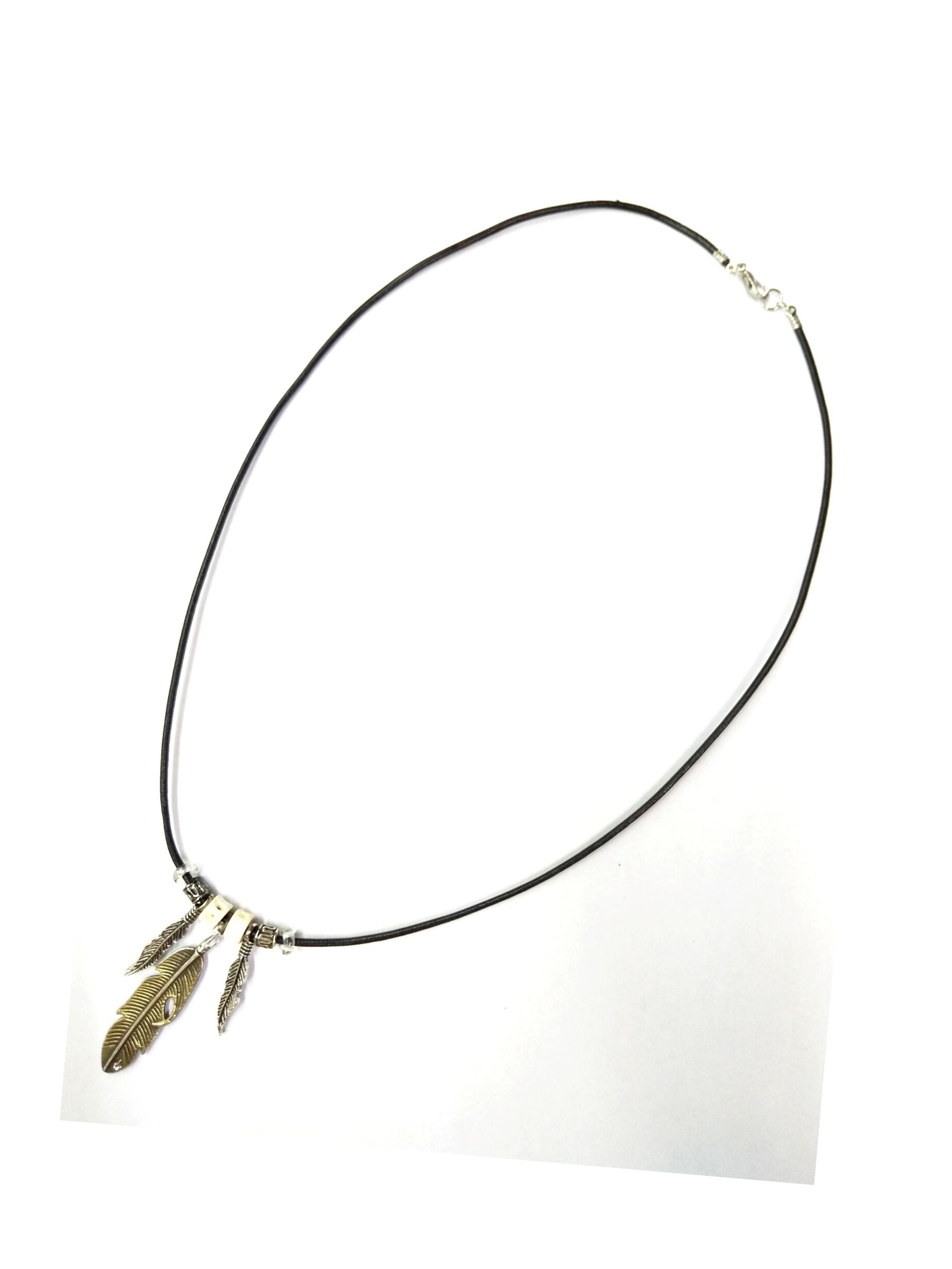 メンズネックレス シルバー&金古美カラー 3連フェザー ブラック本革紐 Y-514
