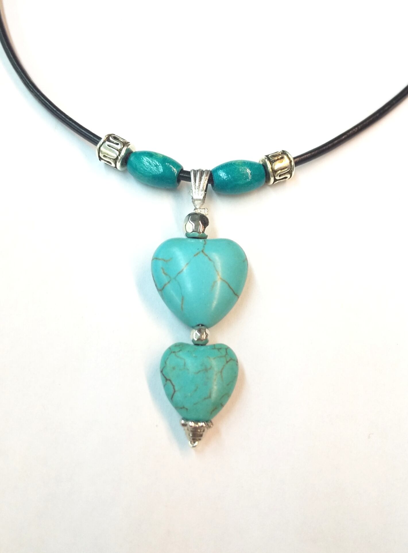 レディースネックレス 2連ハートターコイズ &ブラック本革紐 T-711
