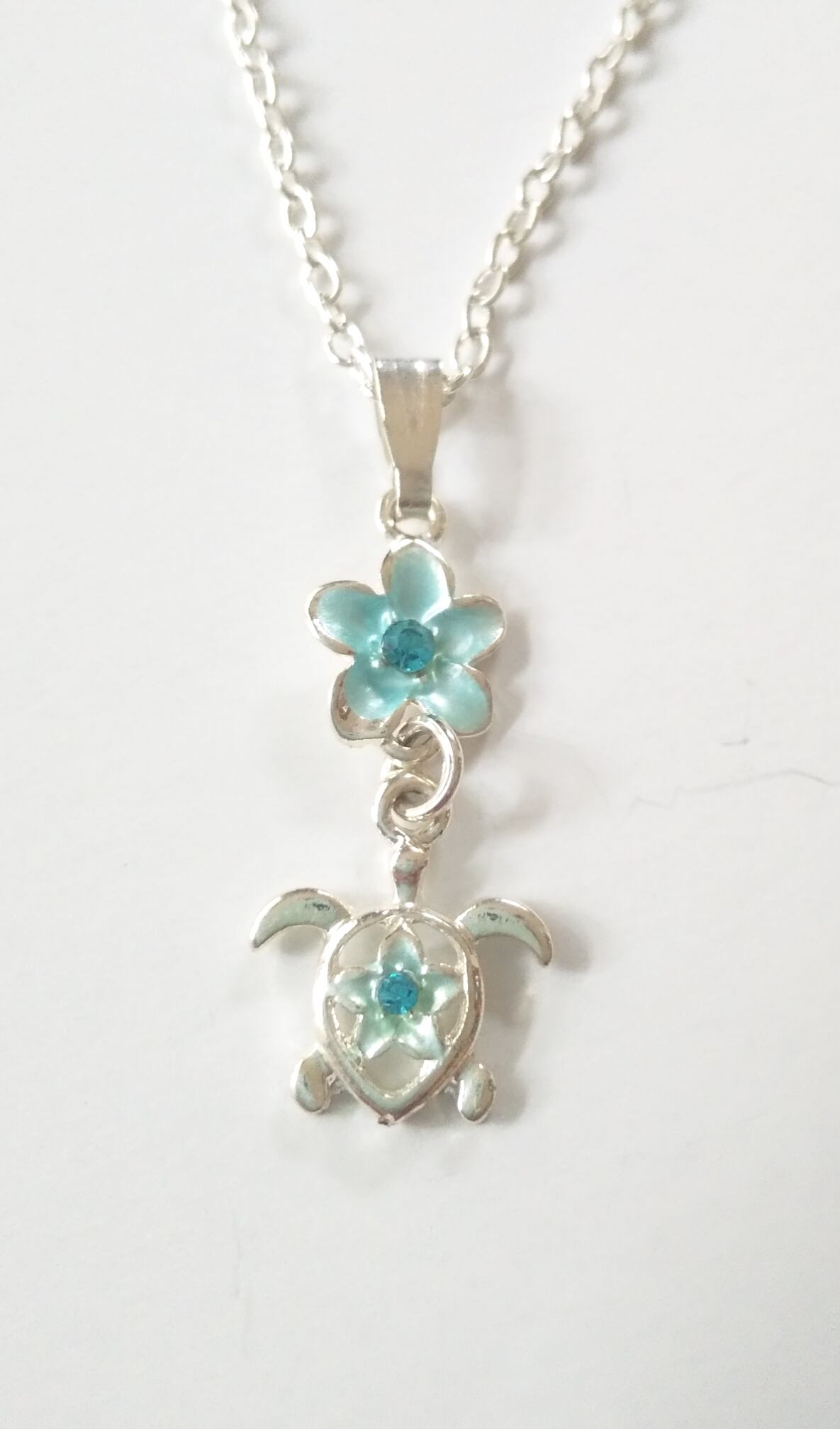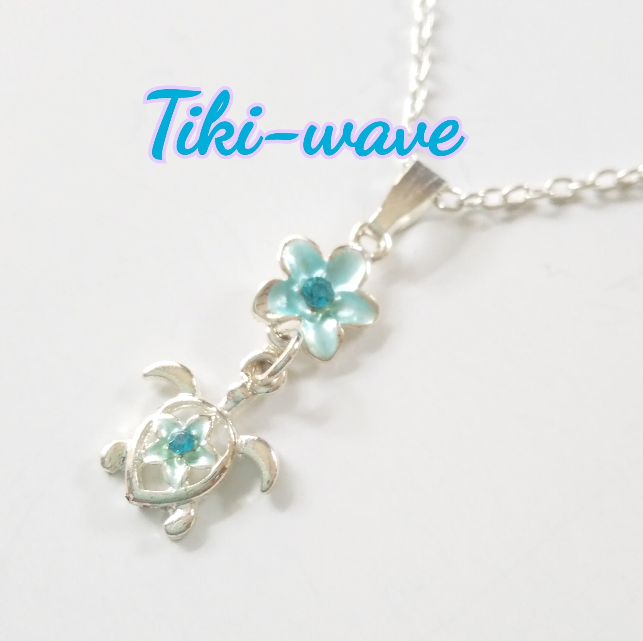 ハワイアンネックレス シルバー ホヌ&プルメリア ミントブルー H-127