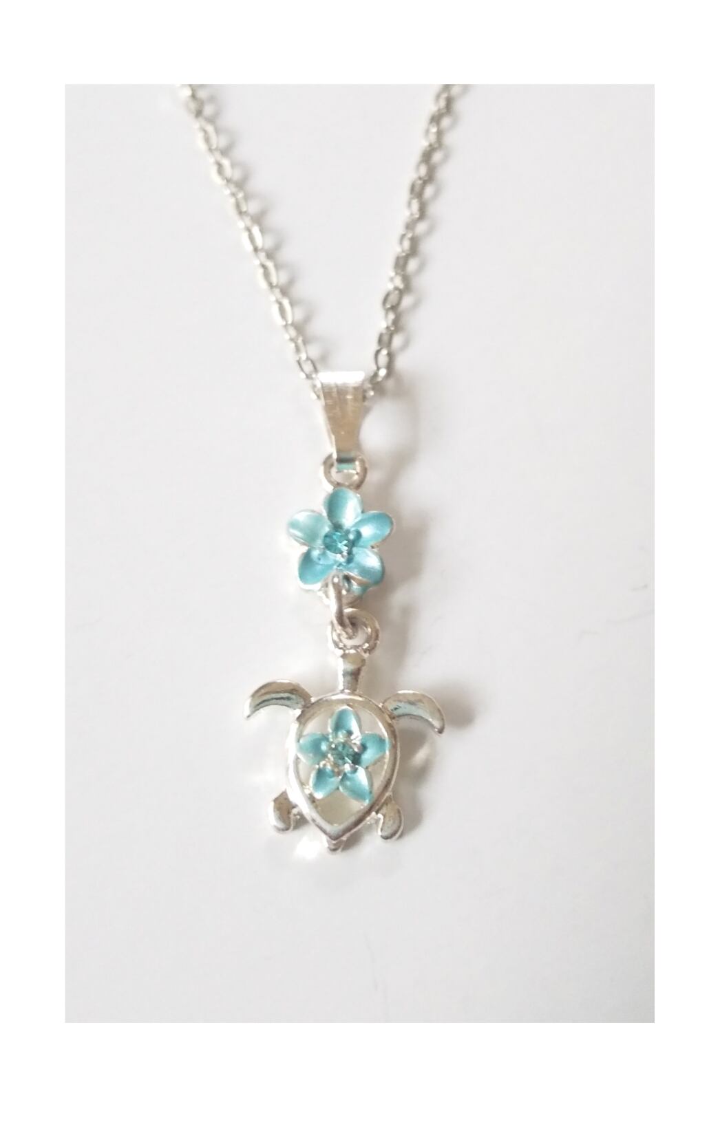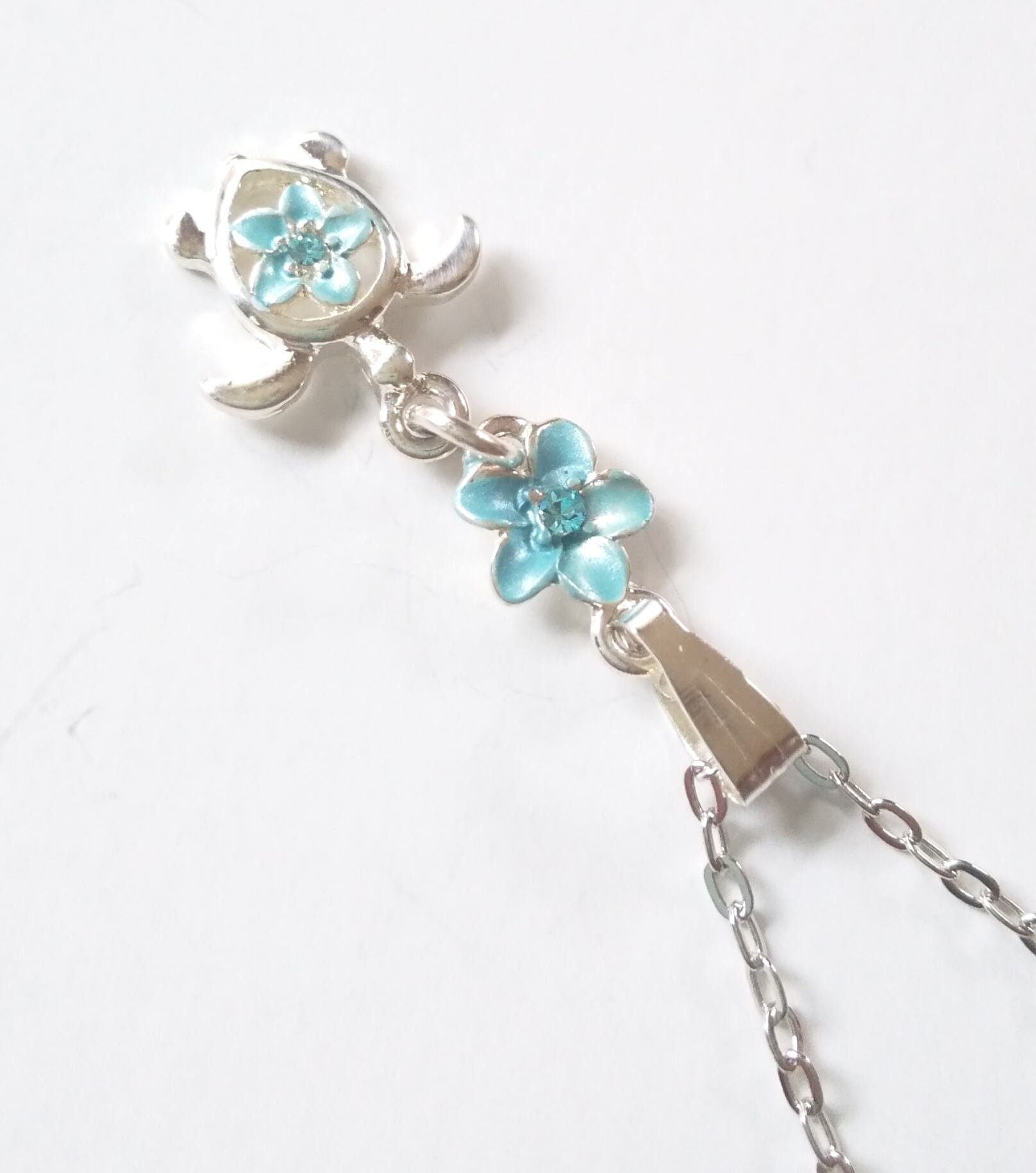 ハワイアンネックレス シルバー ホヌ&プルメリア アクアブルー H-128