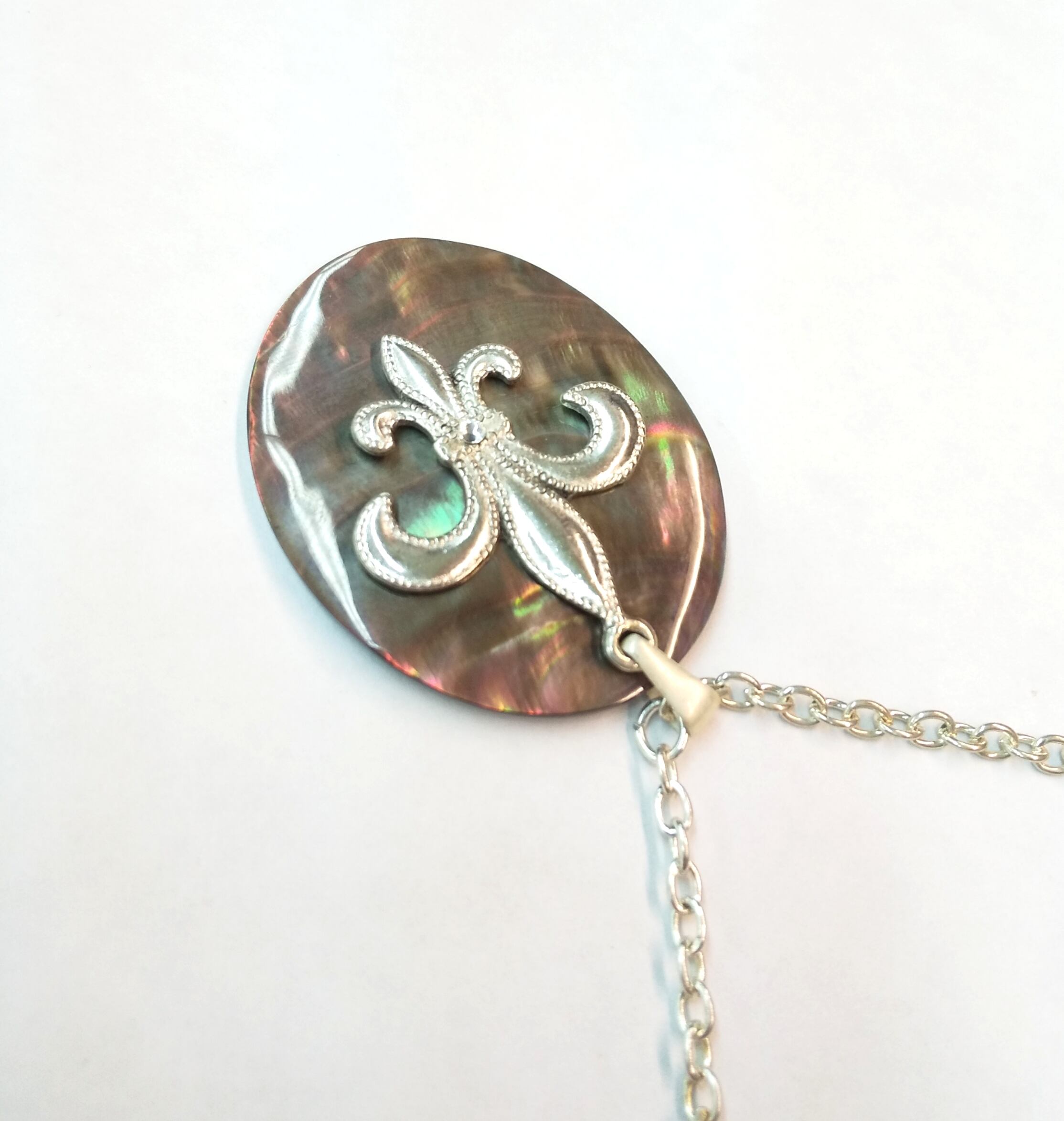 ハワイアンネックレス 黒蝶貝オーバル&シルバー 百合紋章 S-326