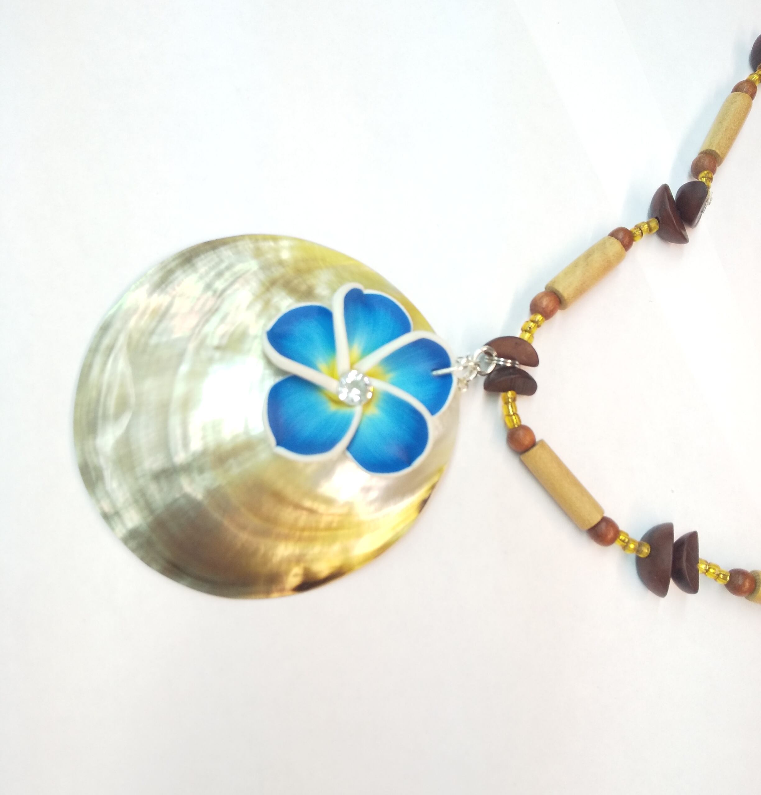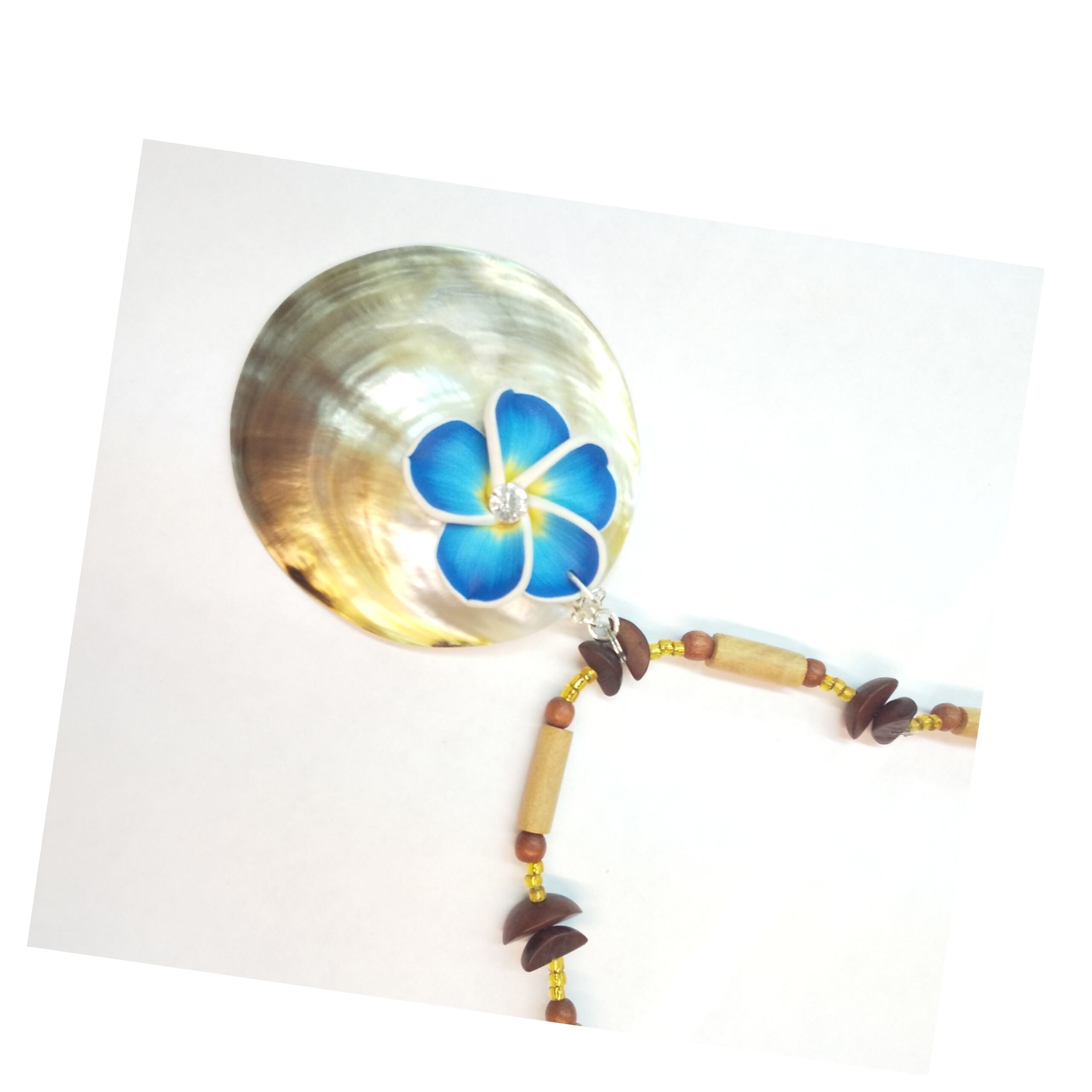 ハワイアンネックレス 天然サークルシェル& ブループルメリア ウッド紐 T-201