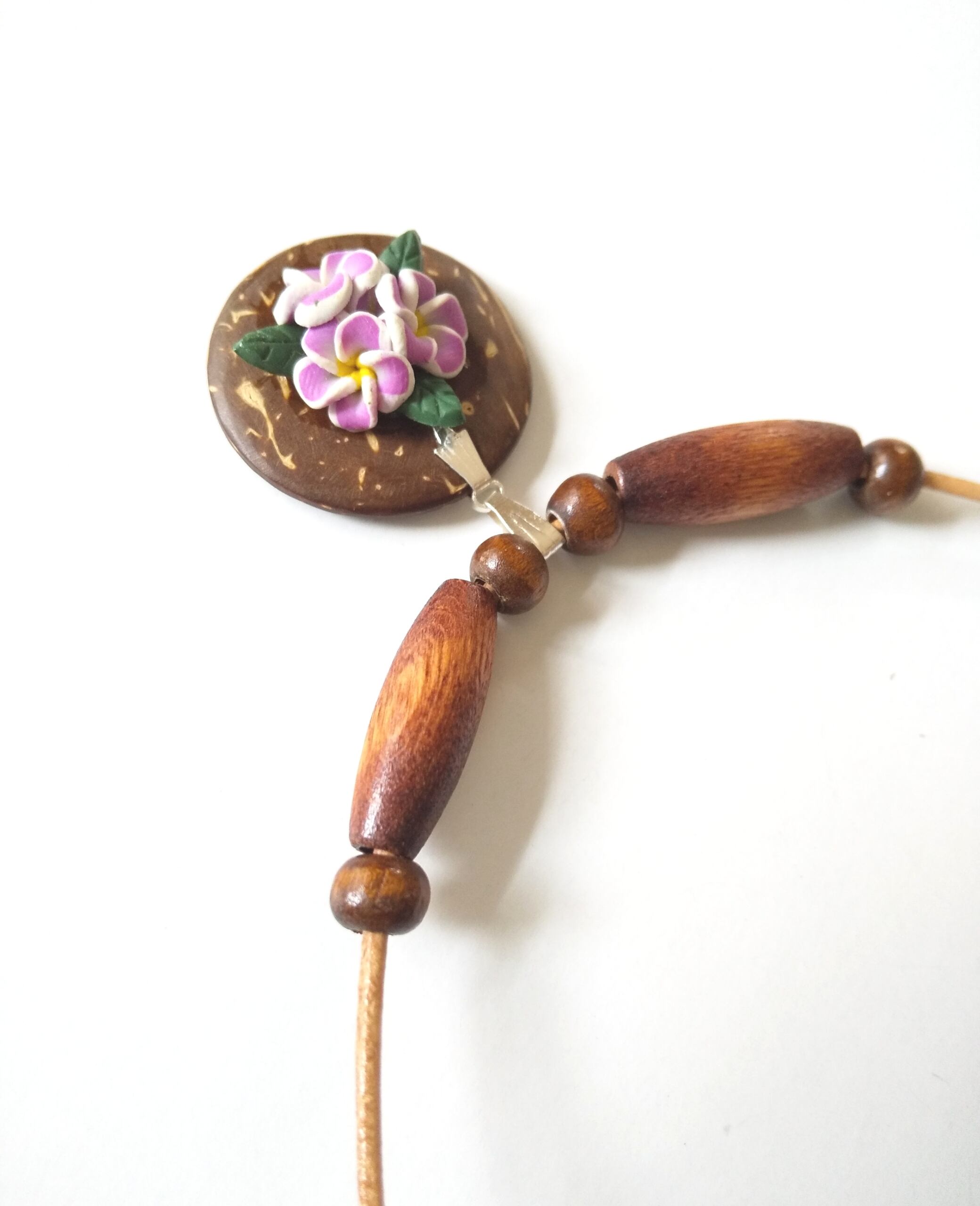 ハワイアンネックレス パープル3連プルメリア& 椰子ウッドサーク P-651
