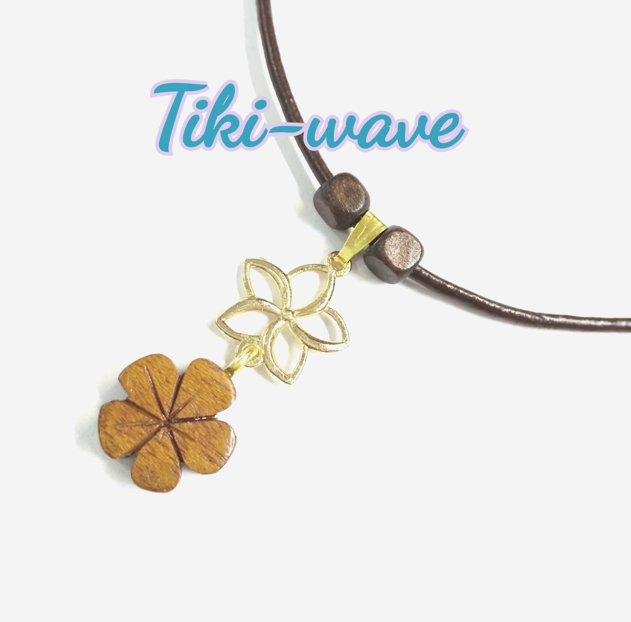 ハワイアンネックレス ブラウンウッド&ゴールド プルメリア 本革紐 P-654
