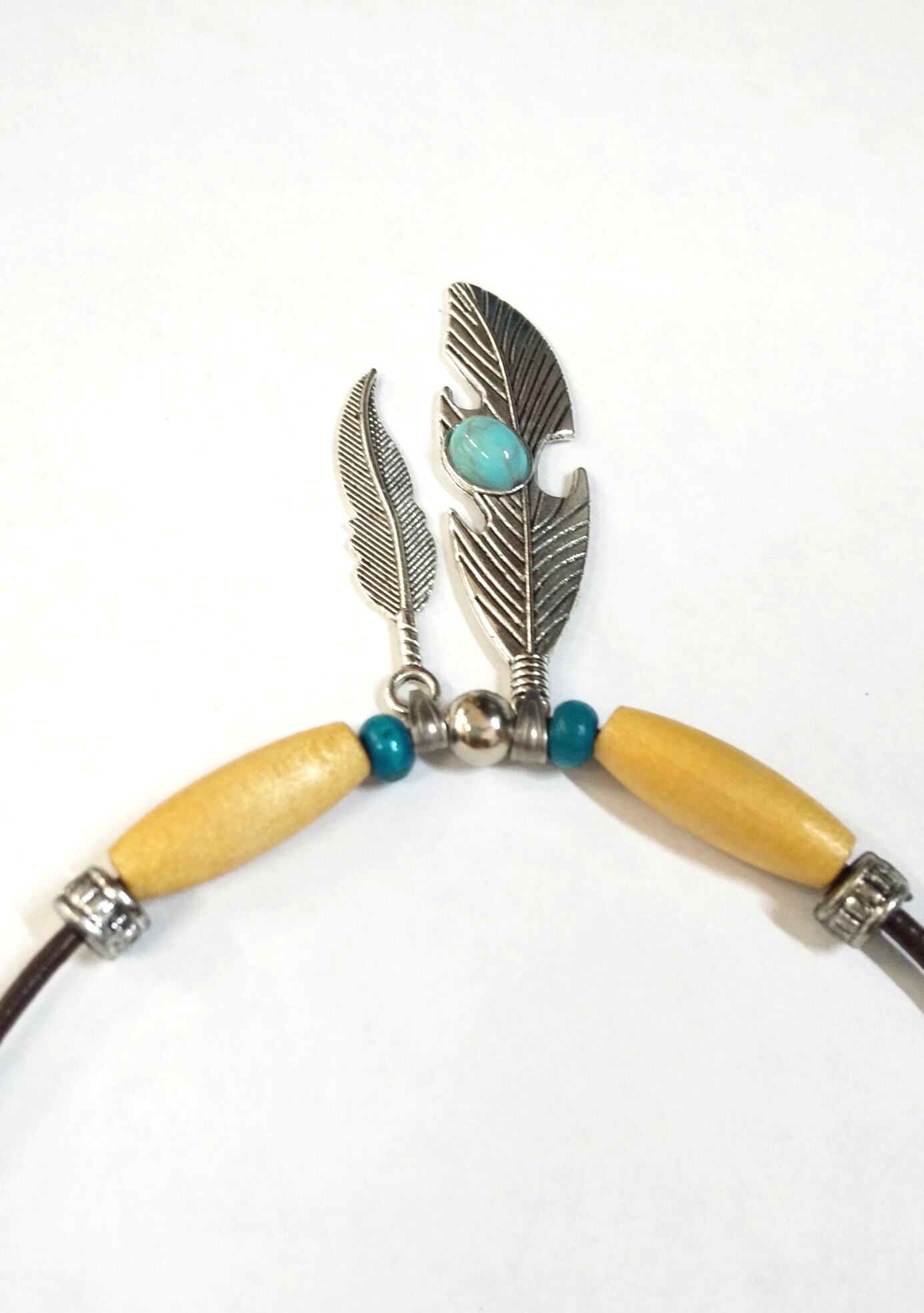 メンズネックレス ブルーターコイズ&2連 シルバーフェザー 本革紐 Y-523