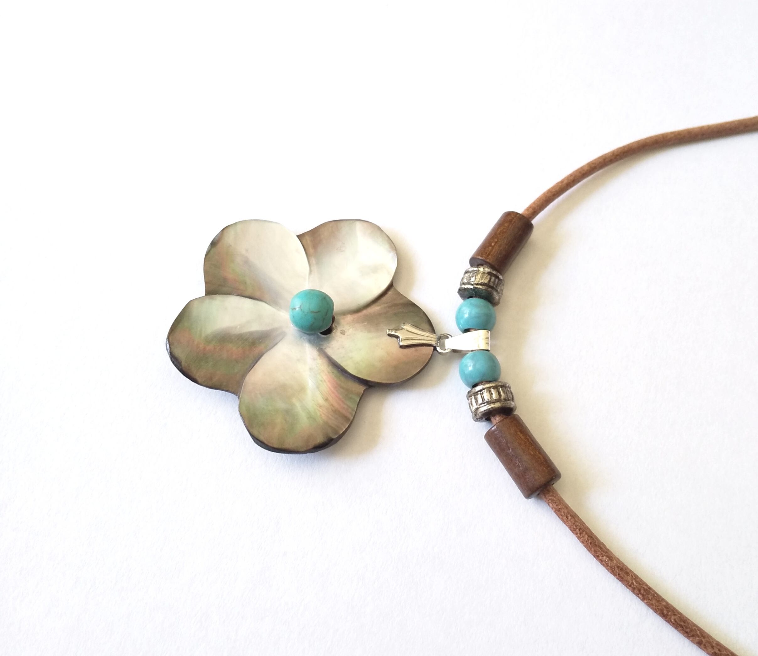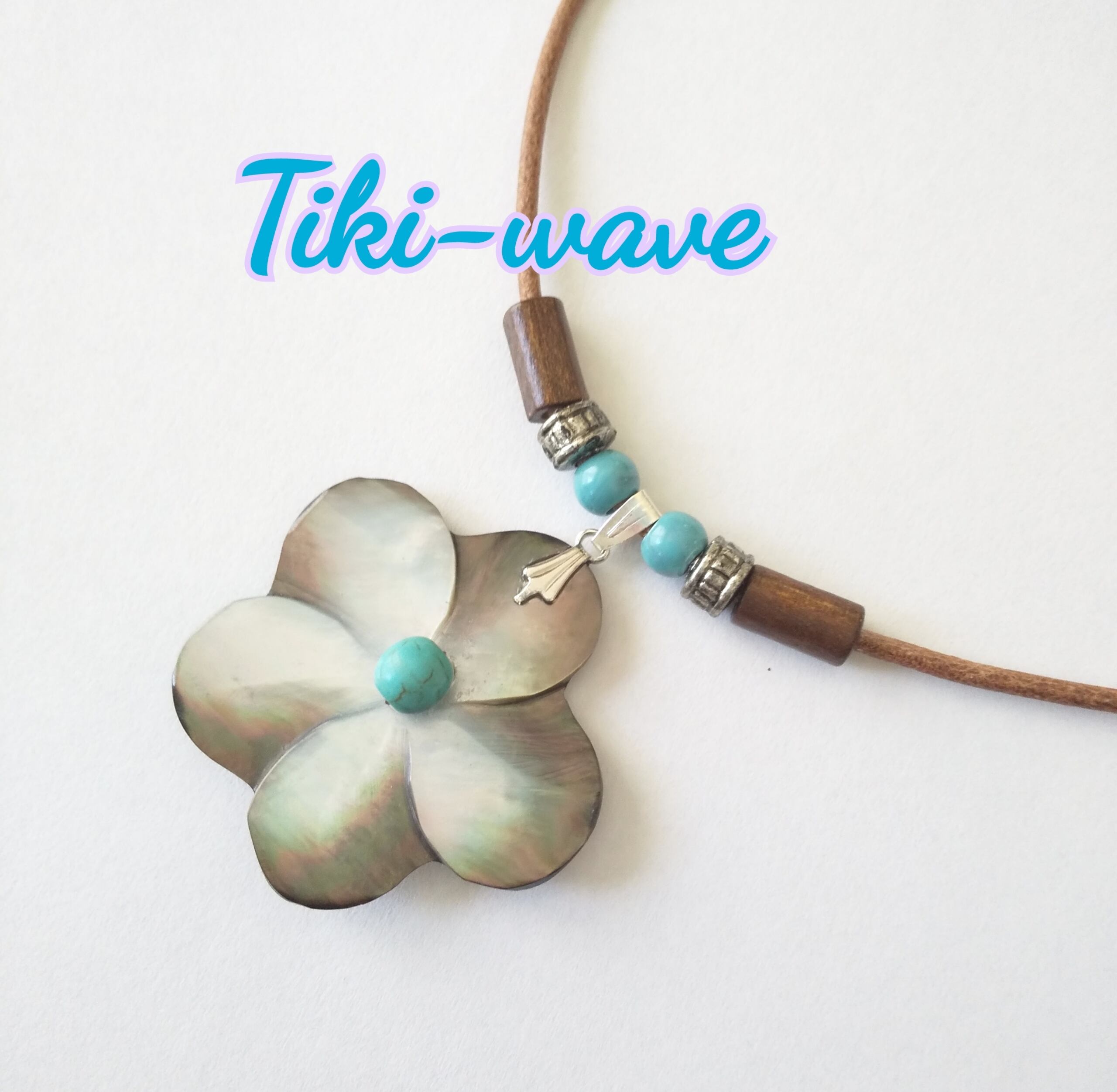 ハワイアンネックレス 天然シェル プルメリア&ターコイズ 本革紐 P-659
