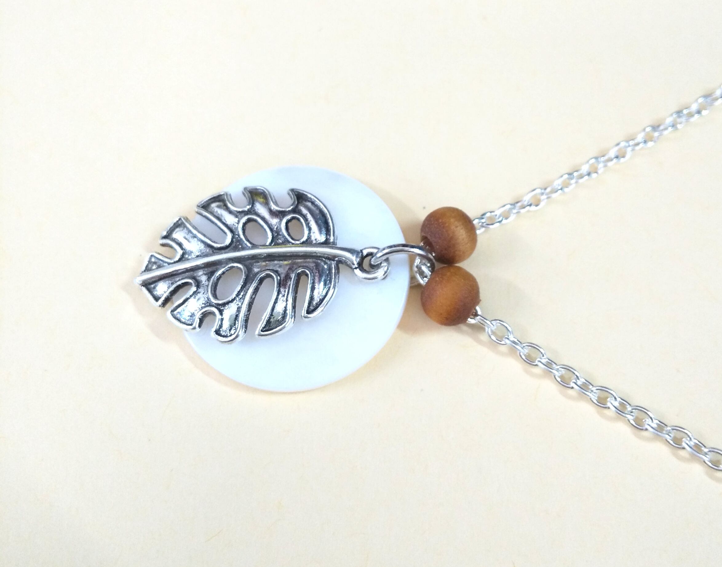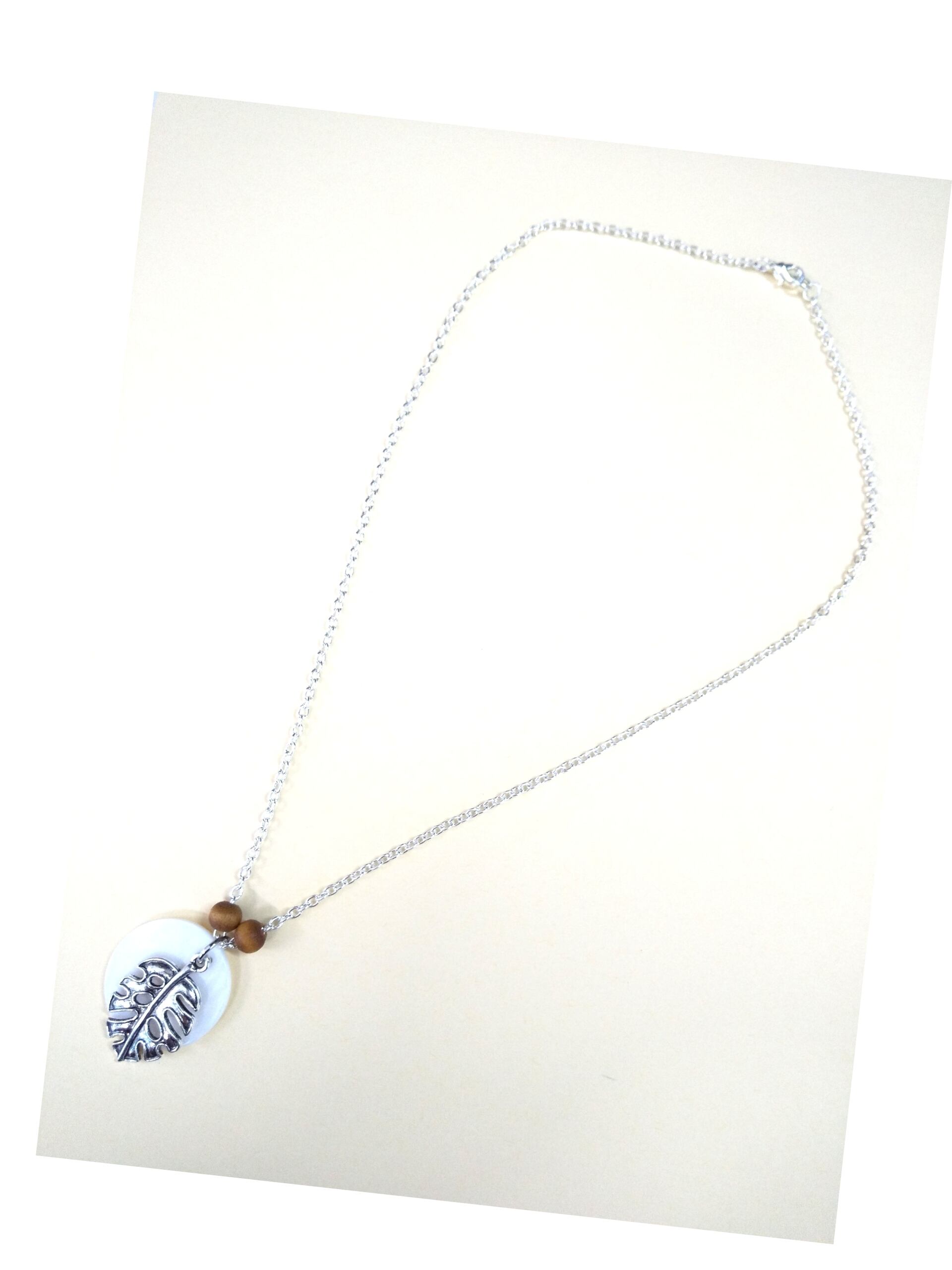 ハワイアンネックレス シルバーモンステラ& ホワイトラウンドシェル M-508