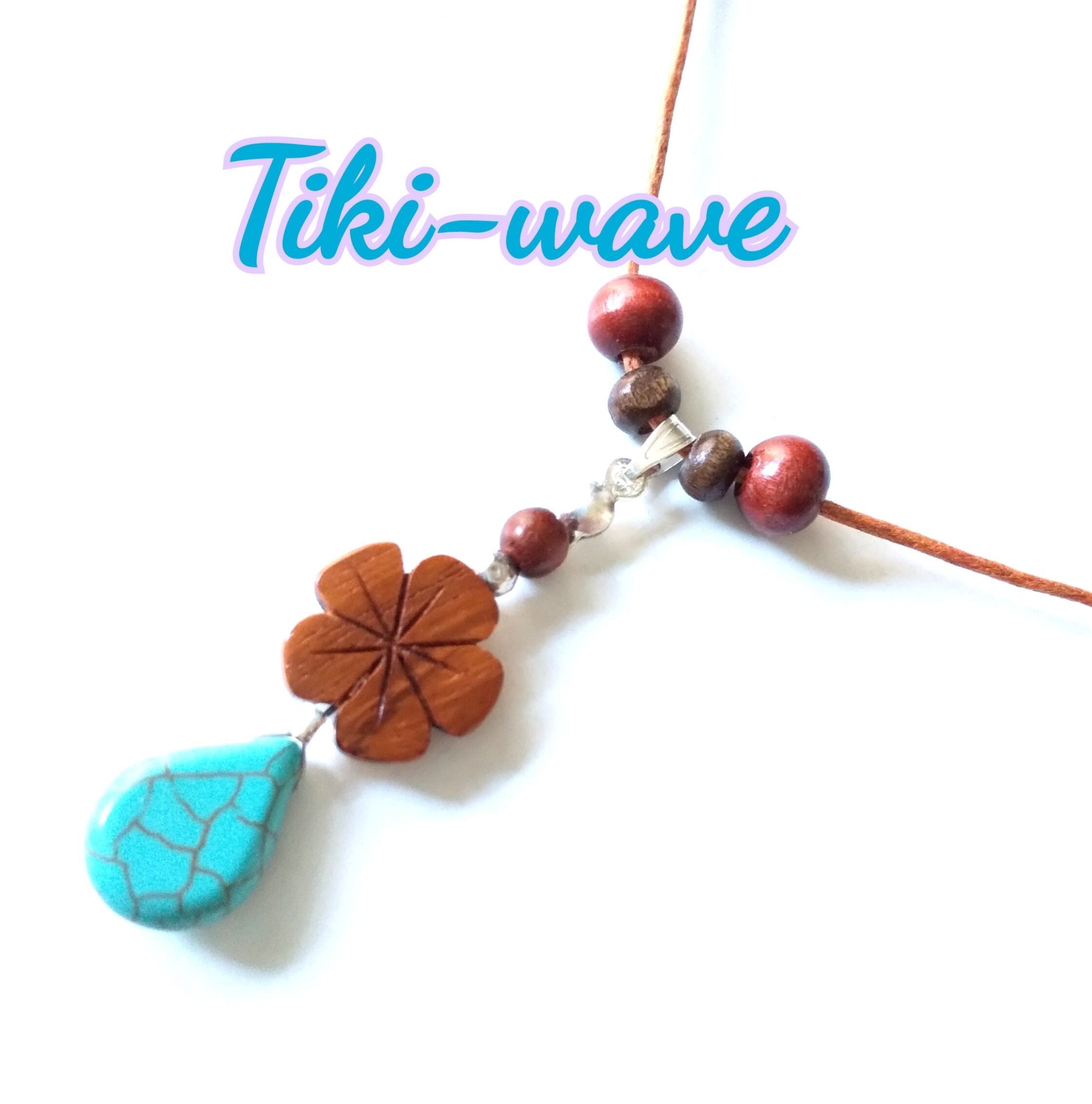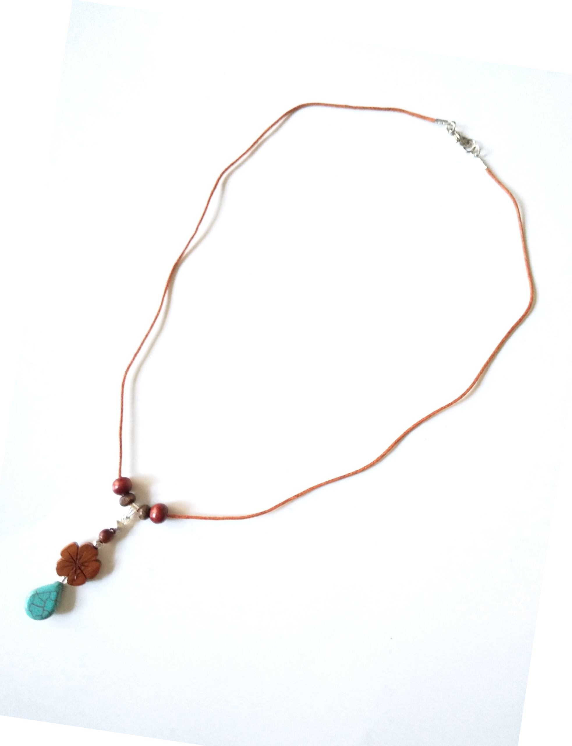 ハワイアンネックレス 天然ウッドプルメリア&ドロップターコイズ T-879