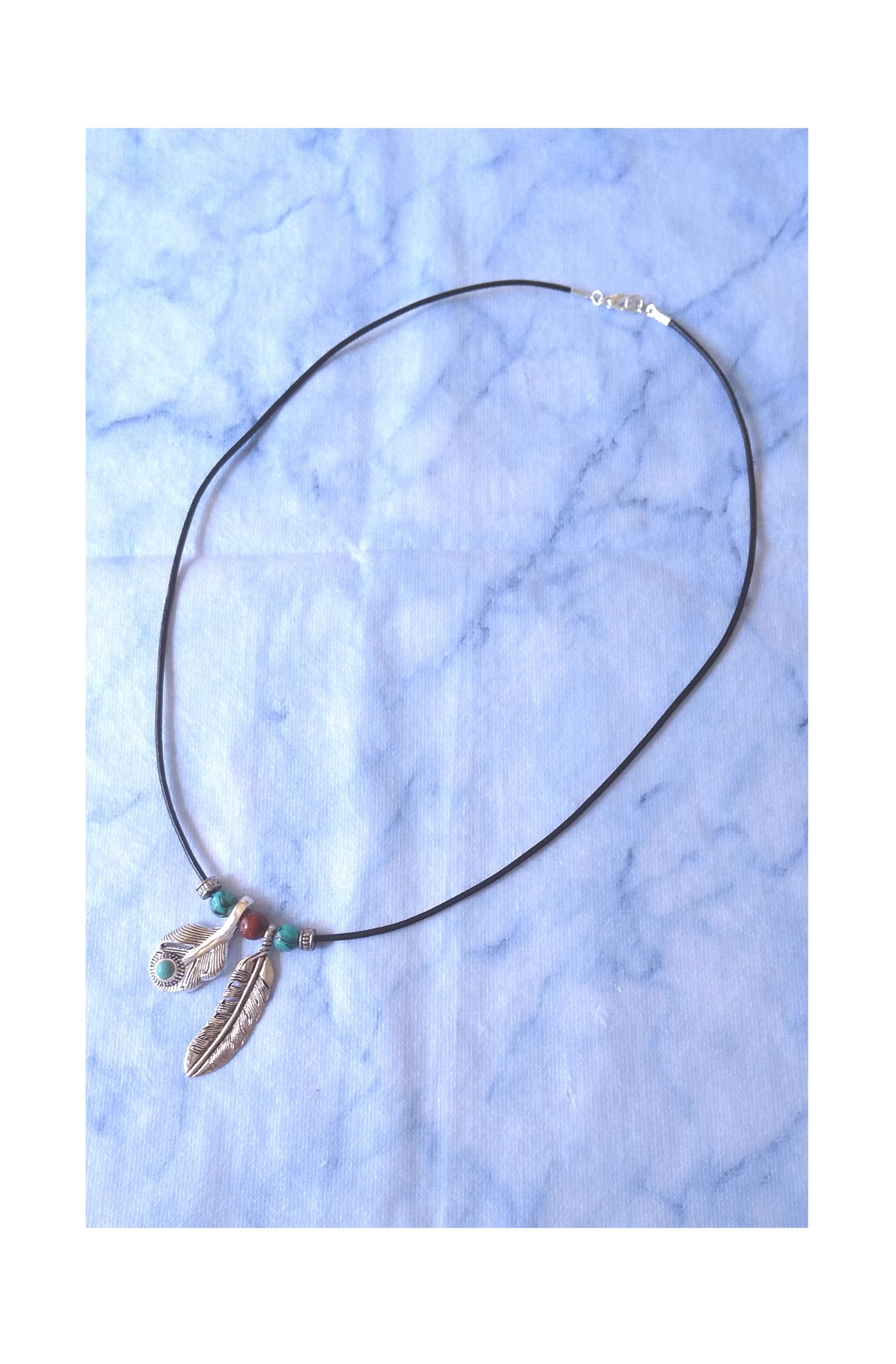 メンズネックレス 2連フェザー シルバー &ターコイズ 本革紐 Y-526