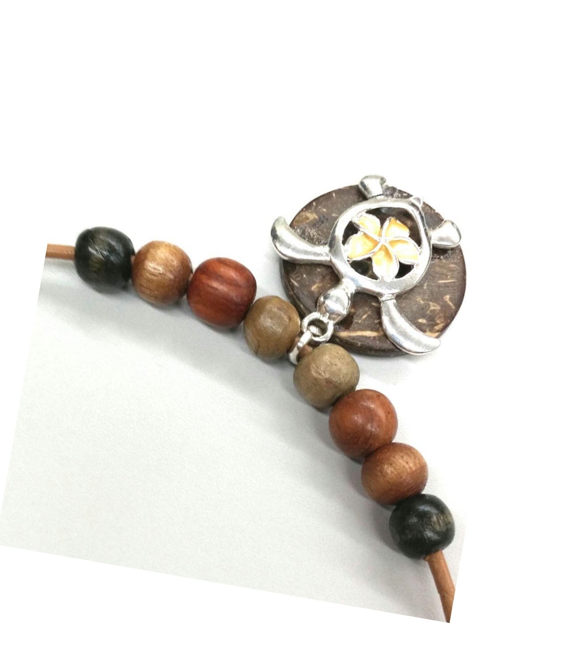 ハワイアンネックレス シルバープルメリアホヌ &椰子ウッド 本革紐 Y-106