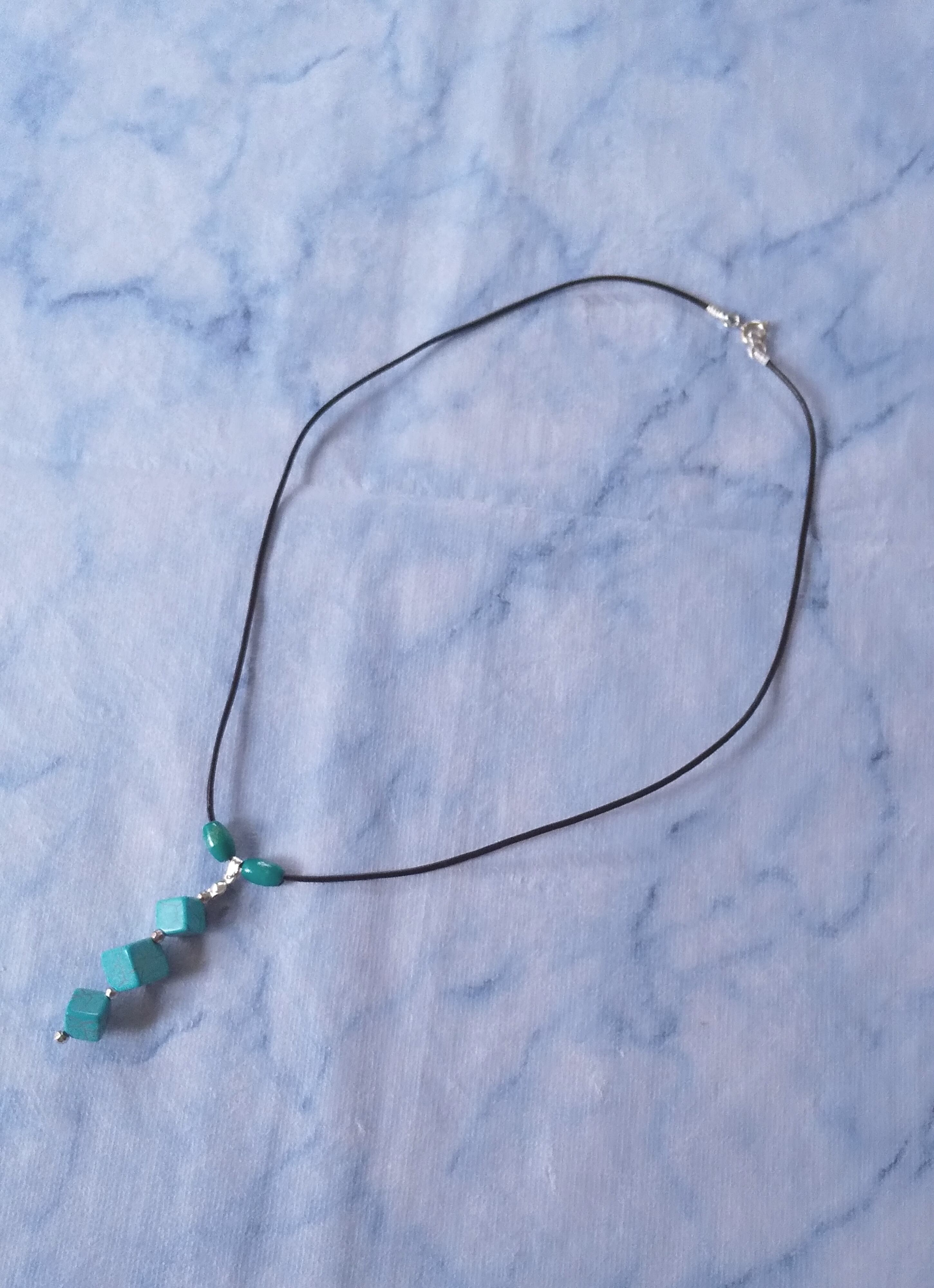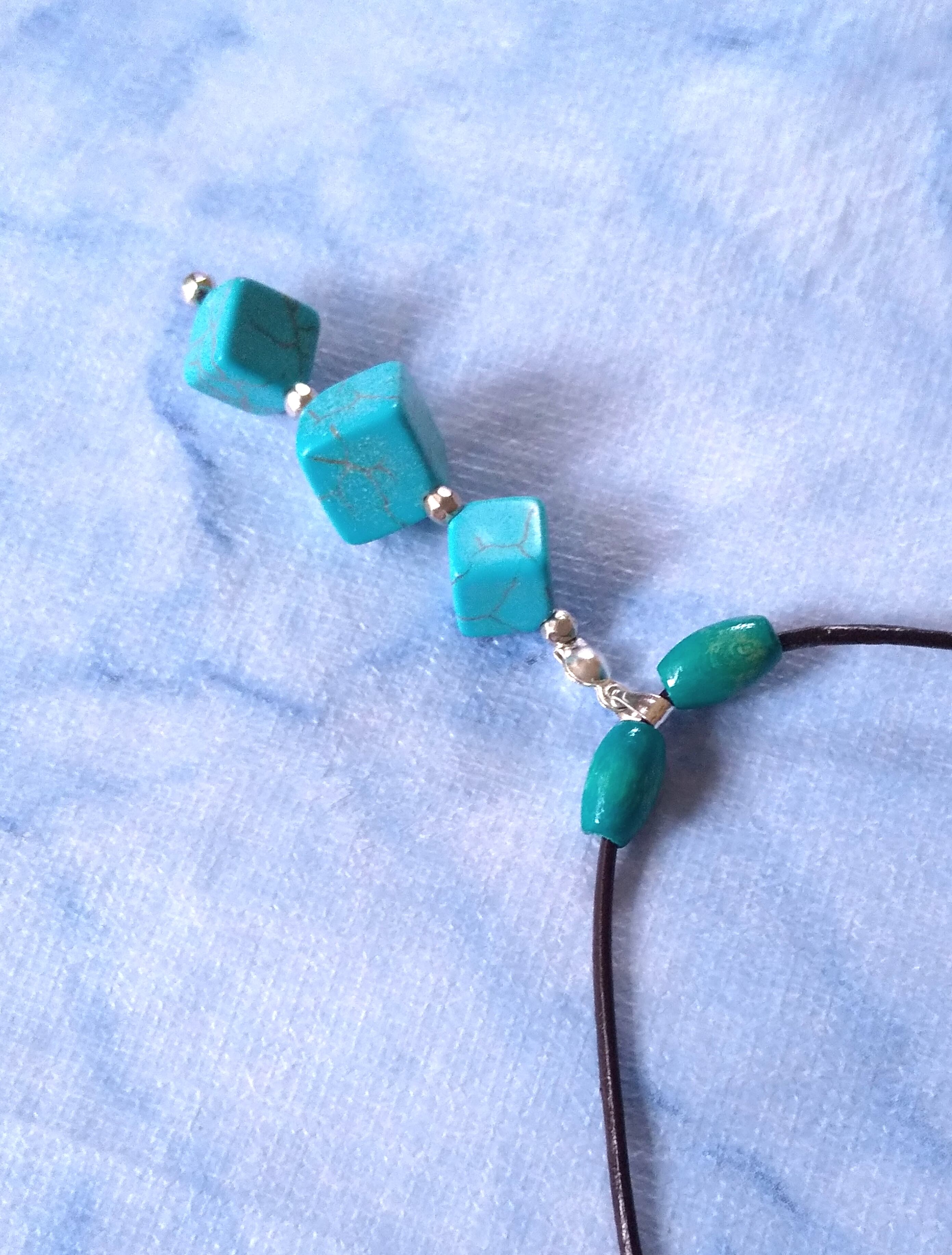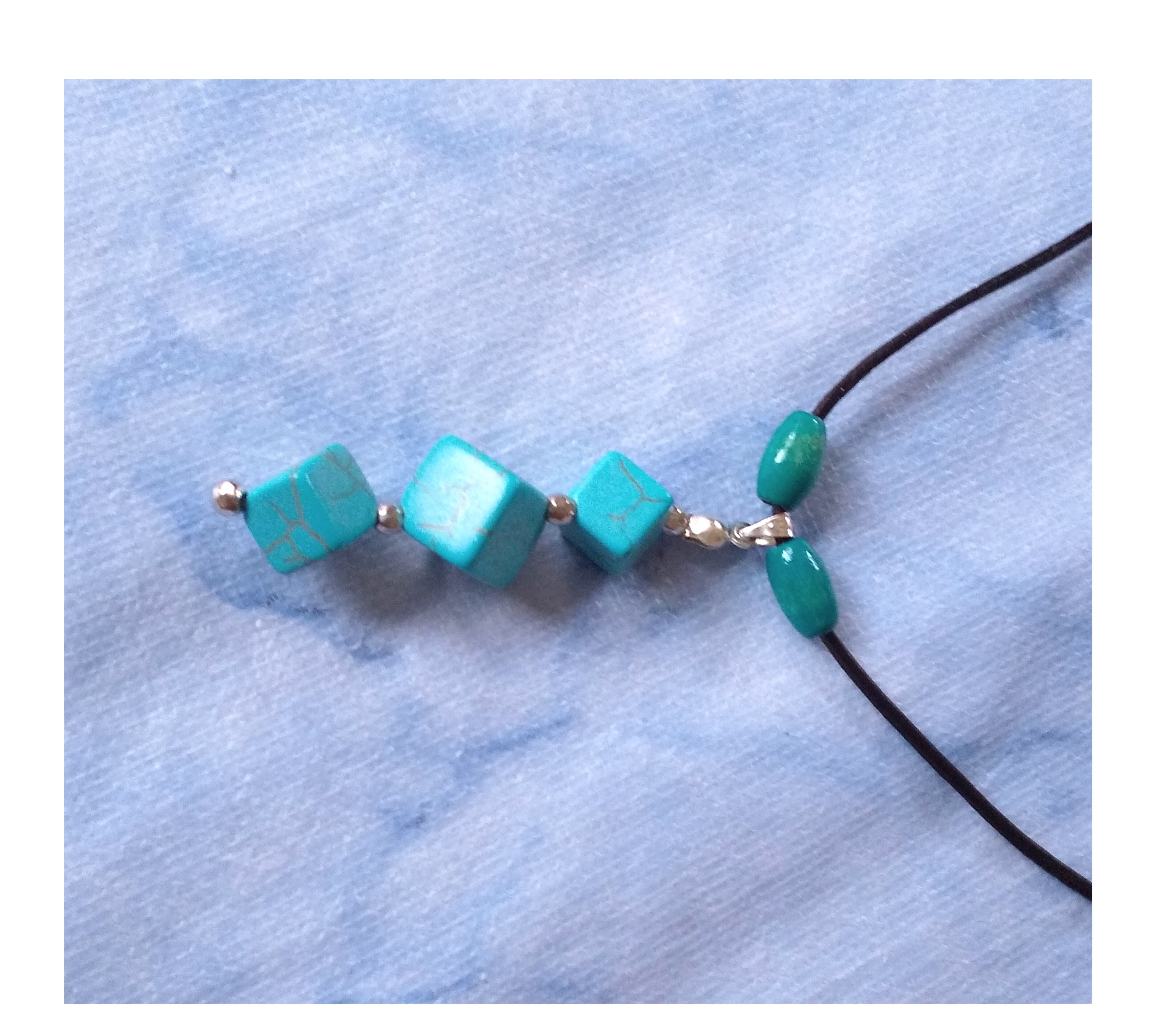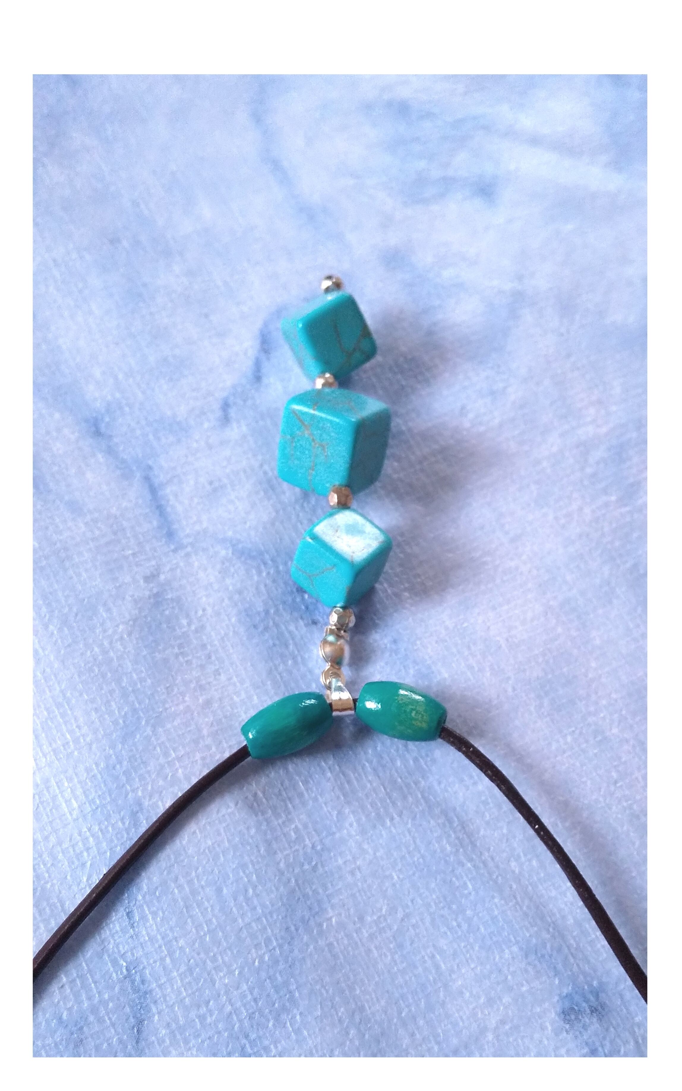 メンズネックレス 3連キューブターコイズ &シルバー 本革黒紐 T-885