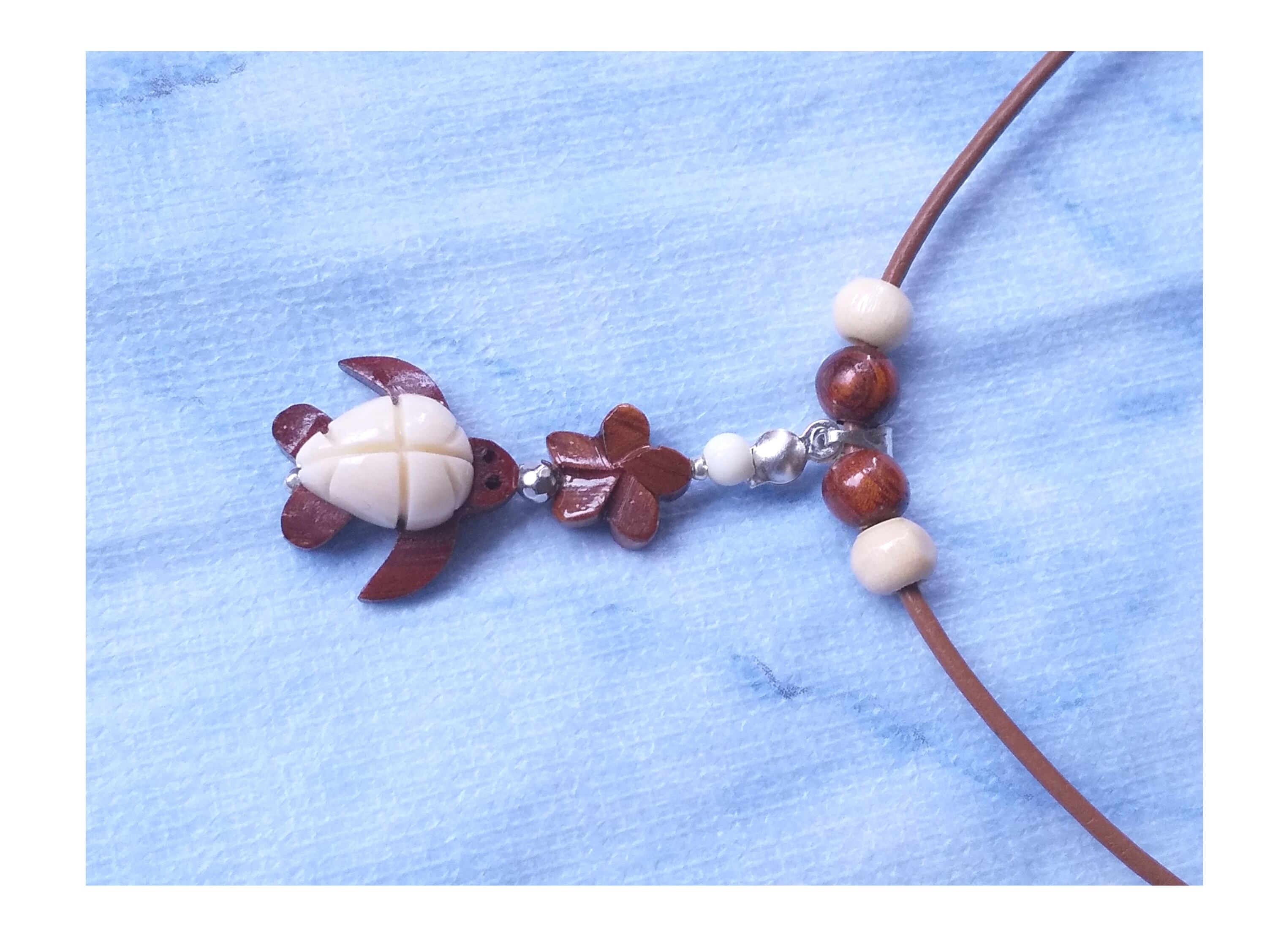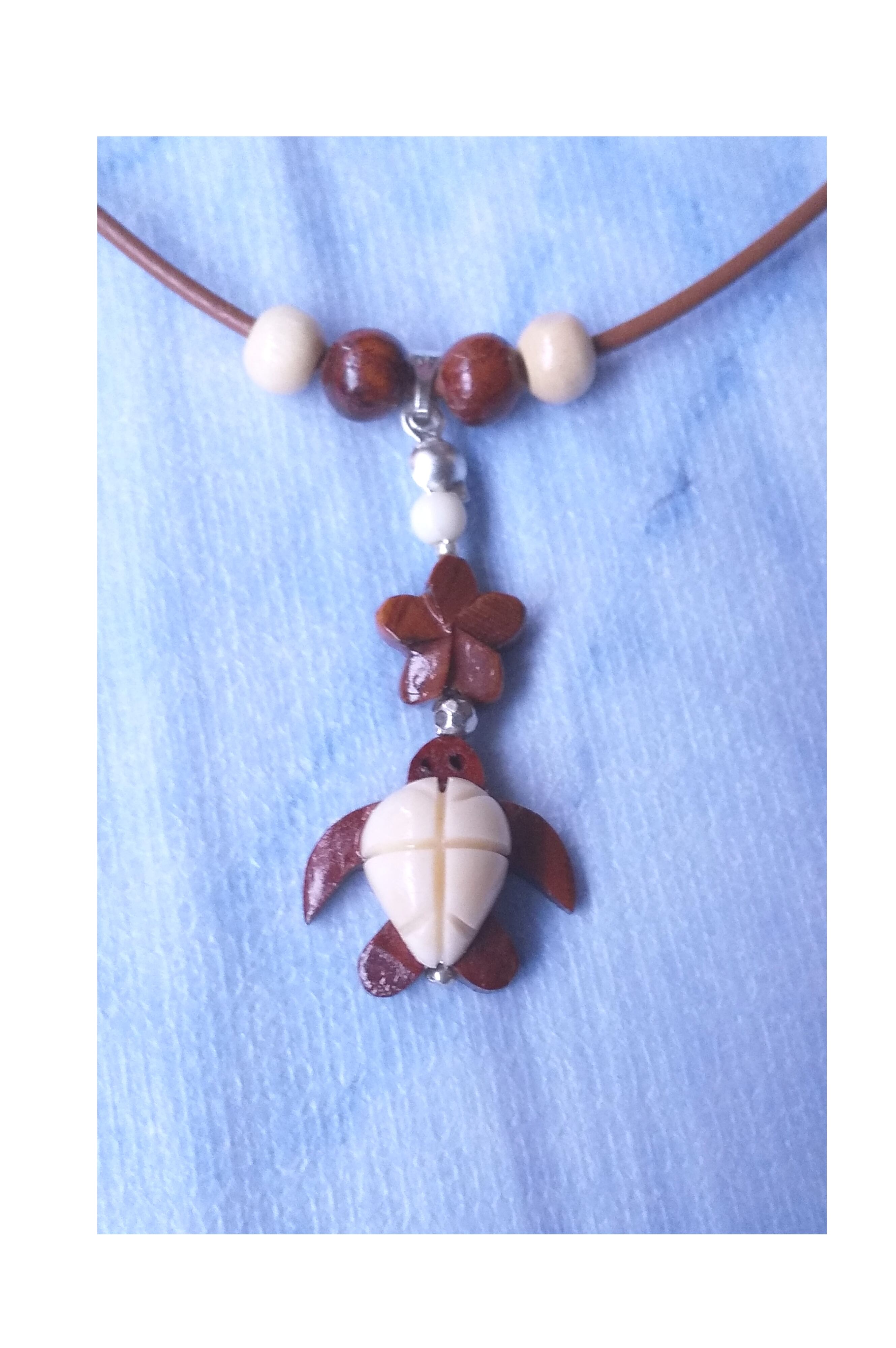 ハワイアンネックレス 天然ハワイウッド ホヌ&プルメリア 本革紐 H-149