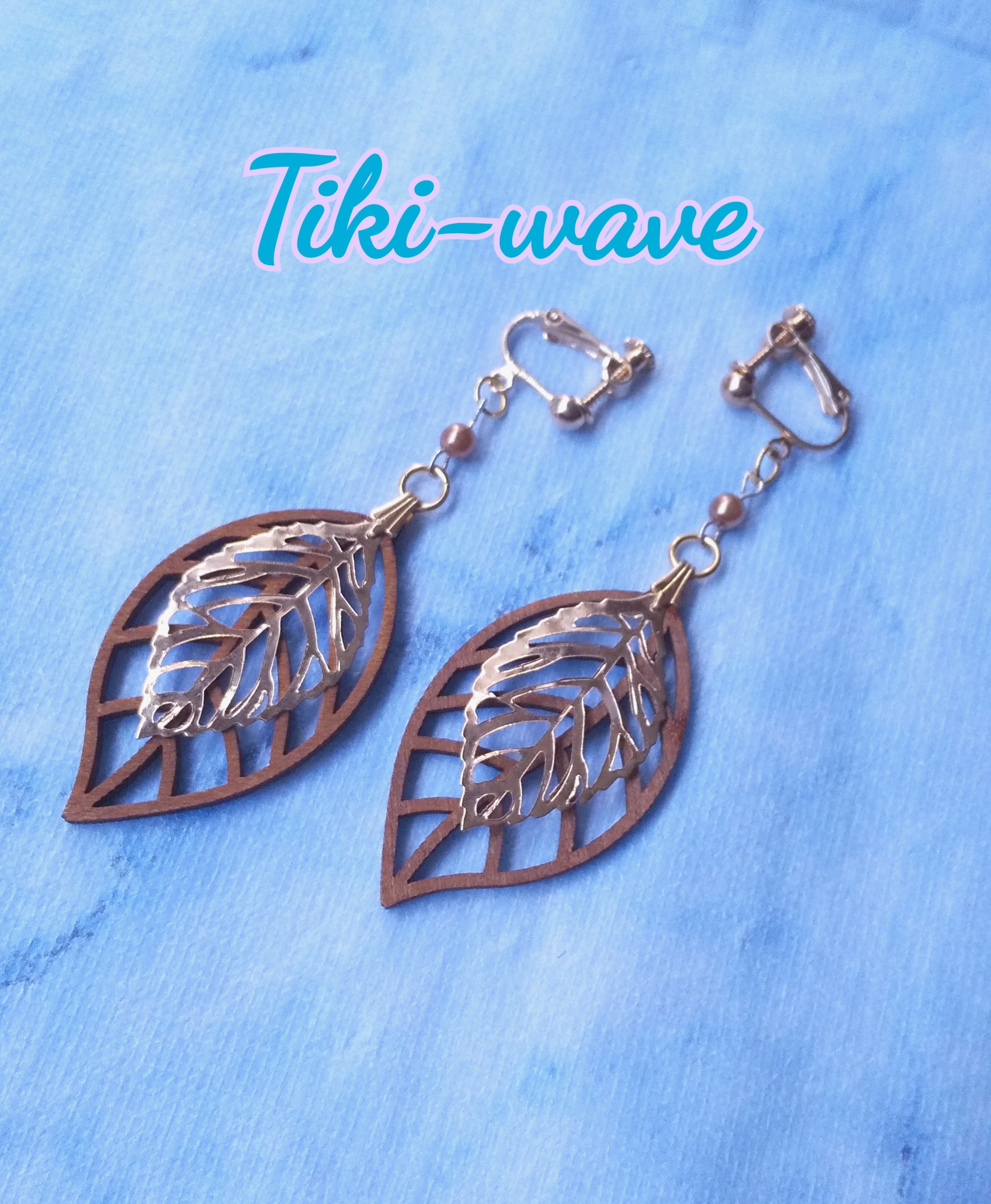 オータムデザインイヤリング 天然ウッドリーフ& ゴールドリーフ A-146