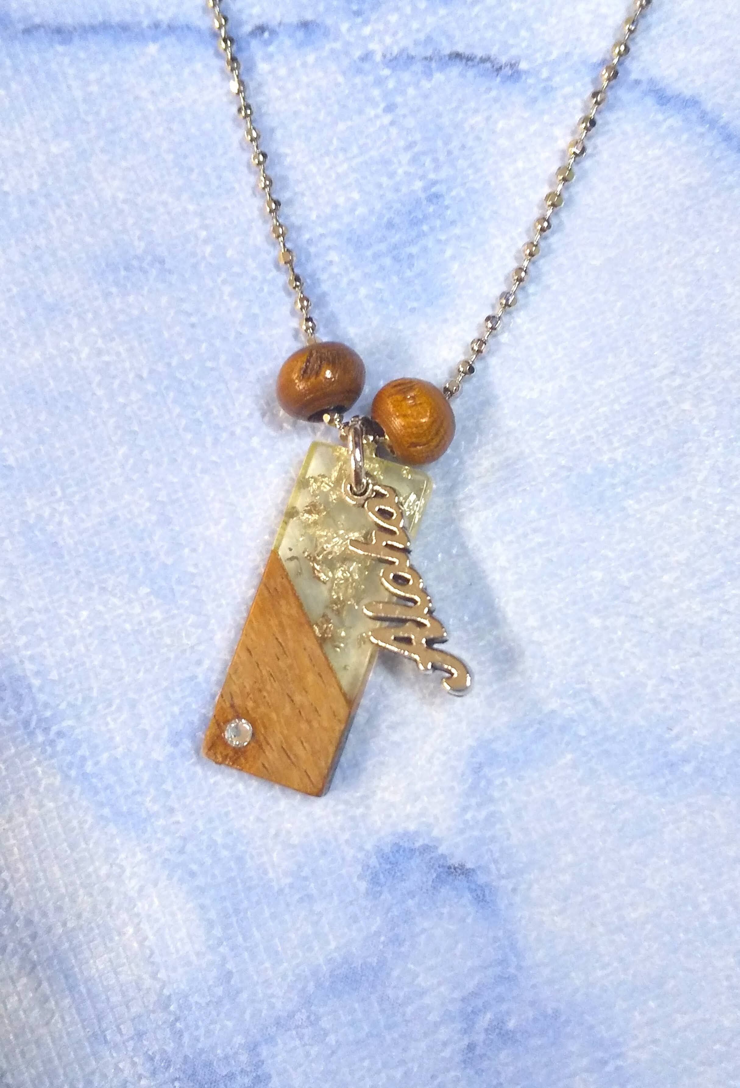 ハワイアンネックレス クリア&ウッドスクエア シルバーAlohaプレート L-617