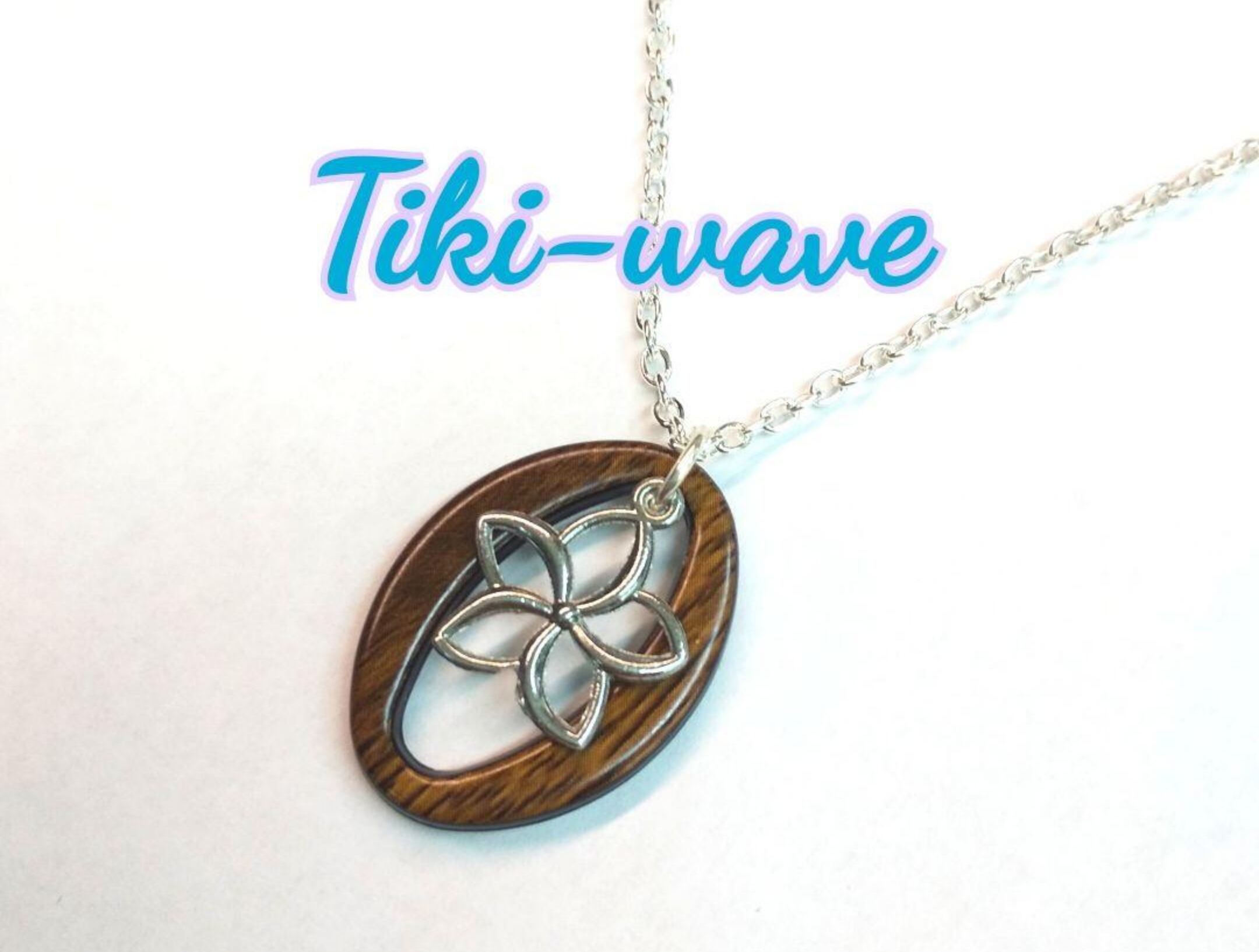 ハワイアンネックレス シルバーカラー プルメリア& ウッドオーバル P-608