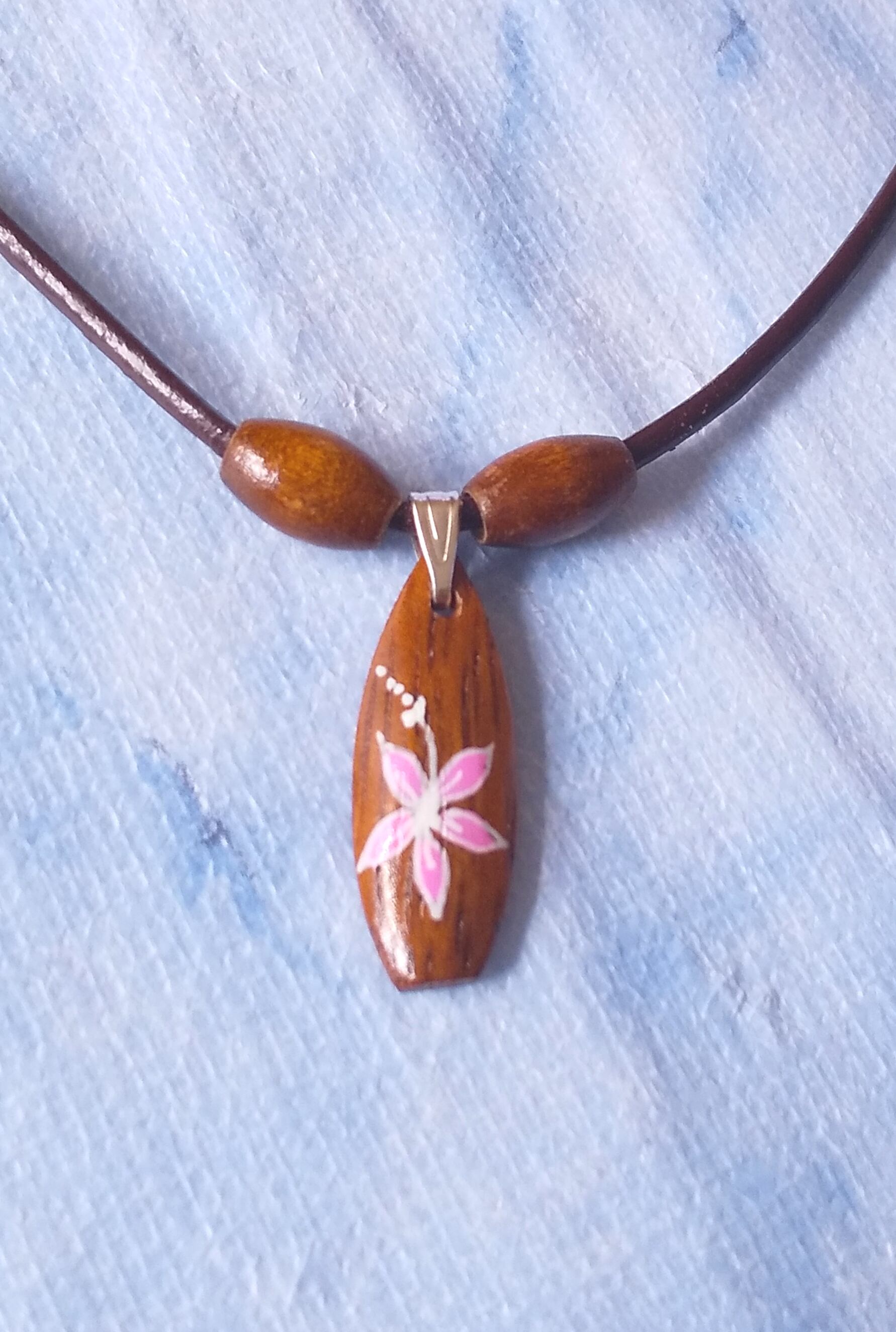 ハワイアンネックレス 天然ウッドサーフボード& ピンクハイビスカス B-324