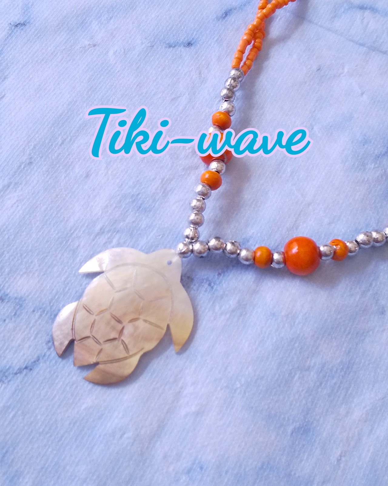 ハワイアンネックレス 天然シェル ホヌ& 2重オレンジビーズ H-161