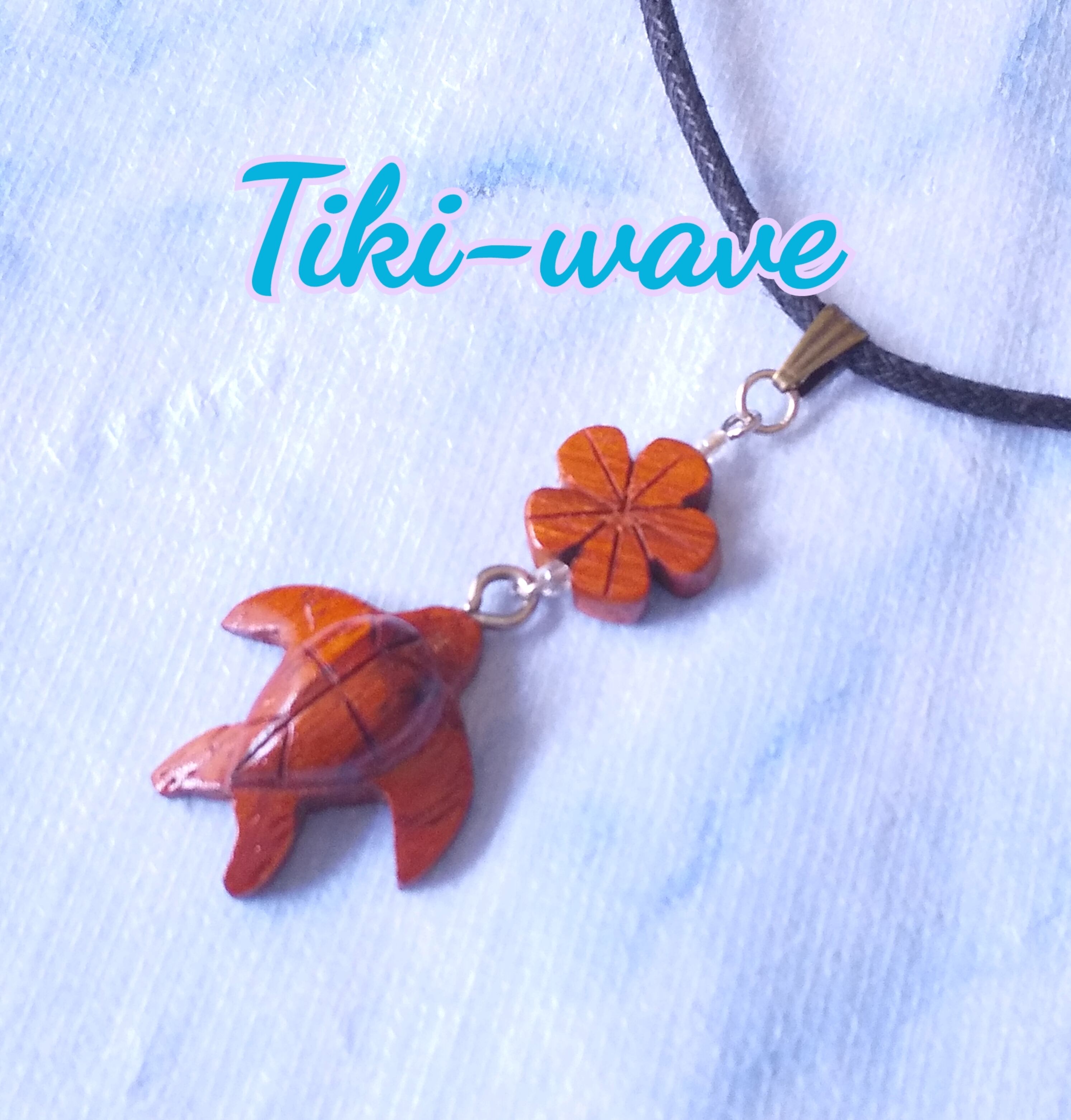 ハワイアンネックレス 天然ハワイウッド ホヌ &プルメリア 本革紐 H-164