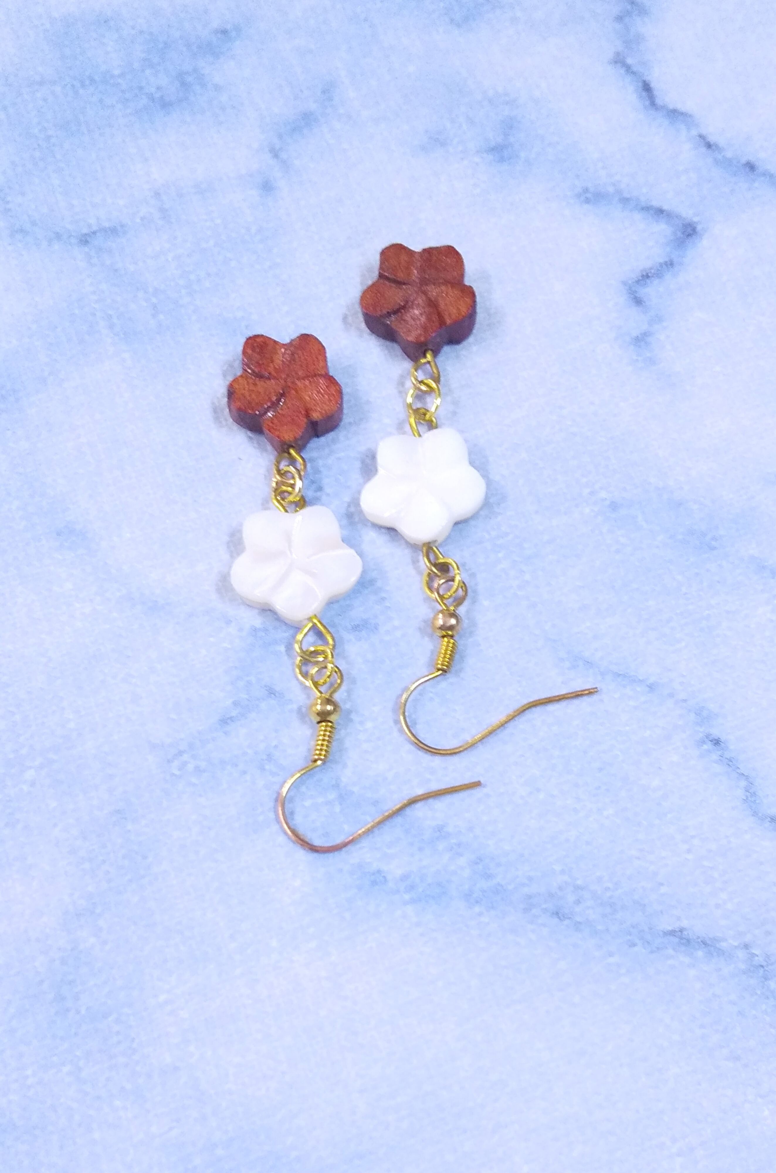 ハワイアクセサリー 天然ウッド&天然シェル プルメリアピアス A-175