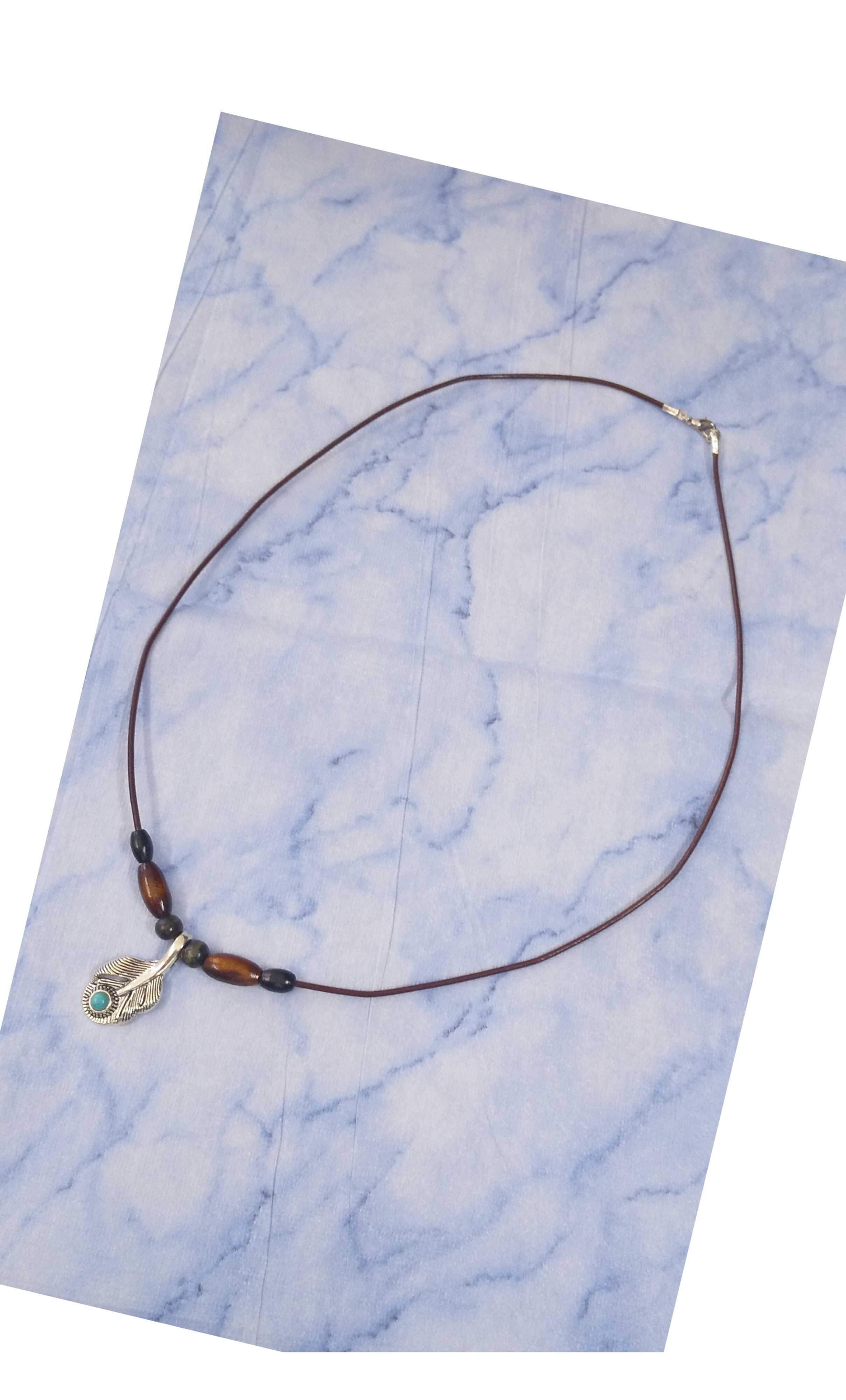 メンズネックレス シルバーワイドフェザー &ターコイズ 本革紐 Y-532