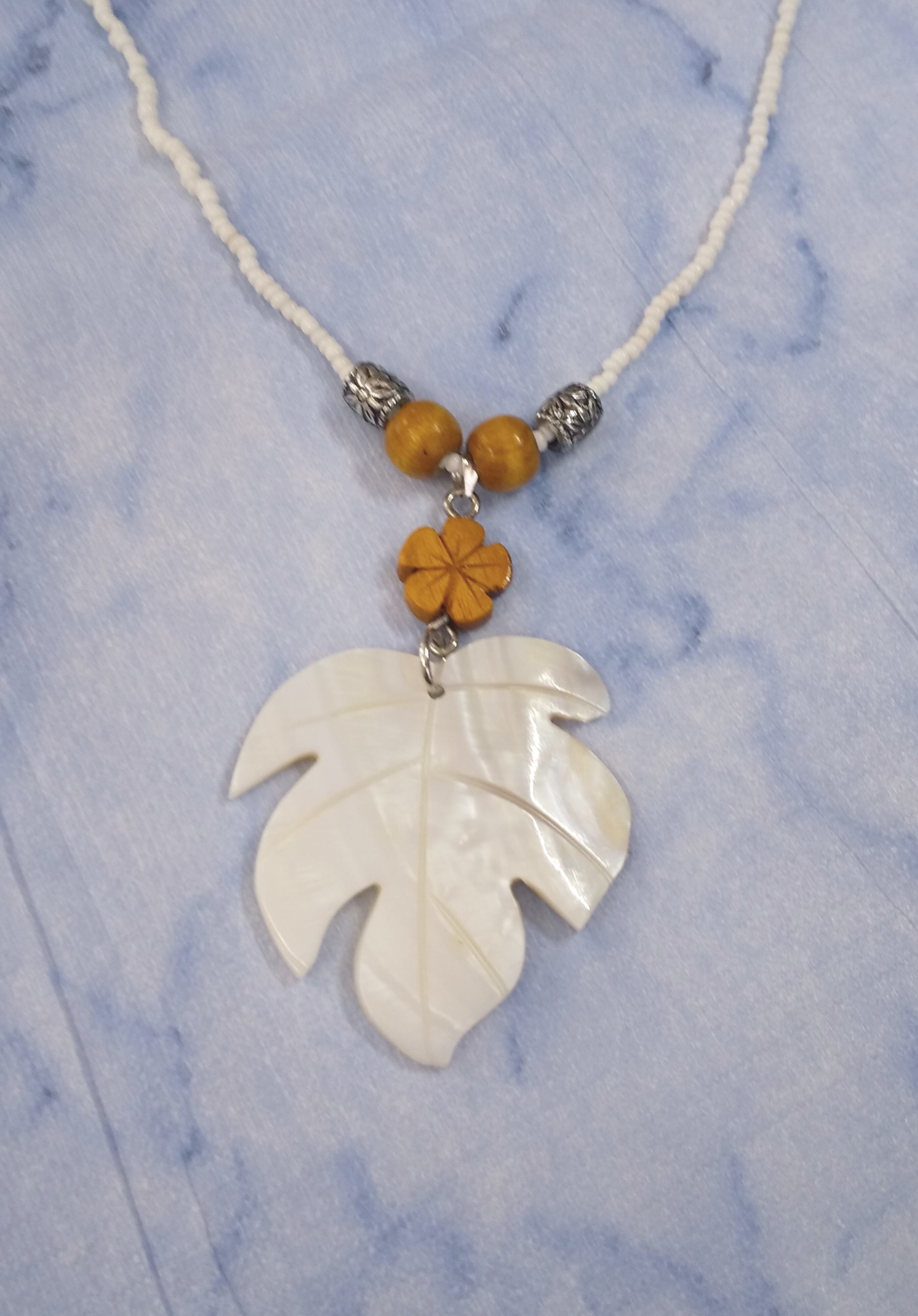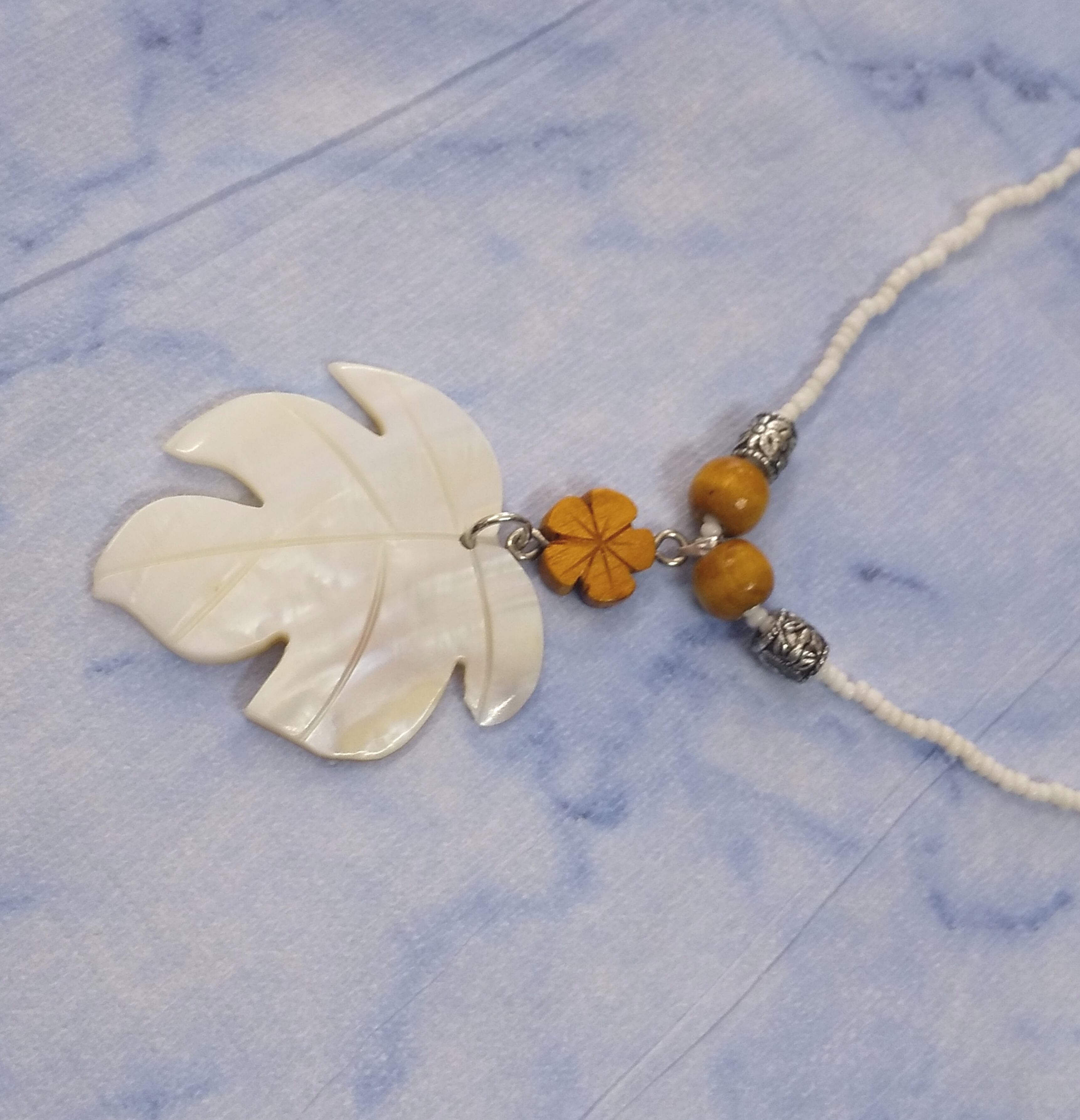 ハワイアンネックレス シェルモンステラ& 天然ウッドプルメリア M-519