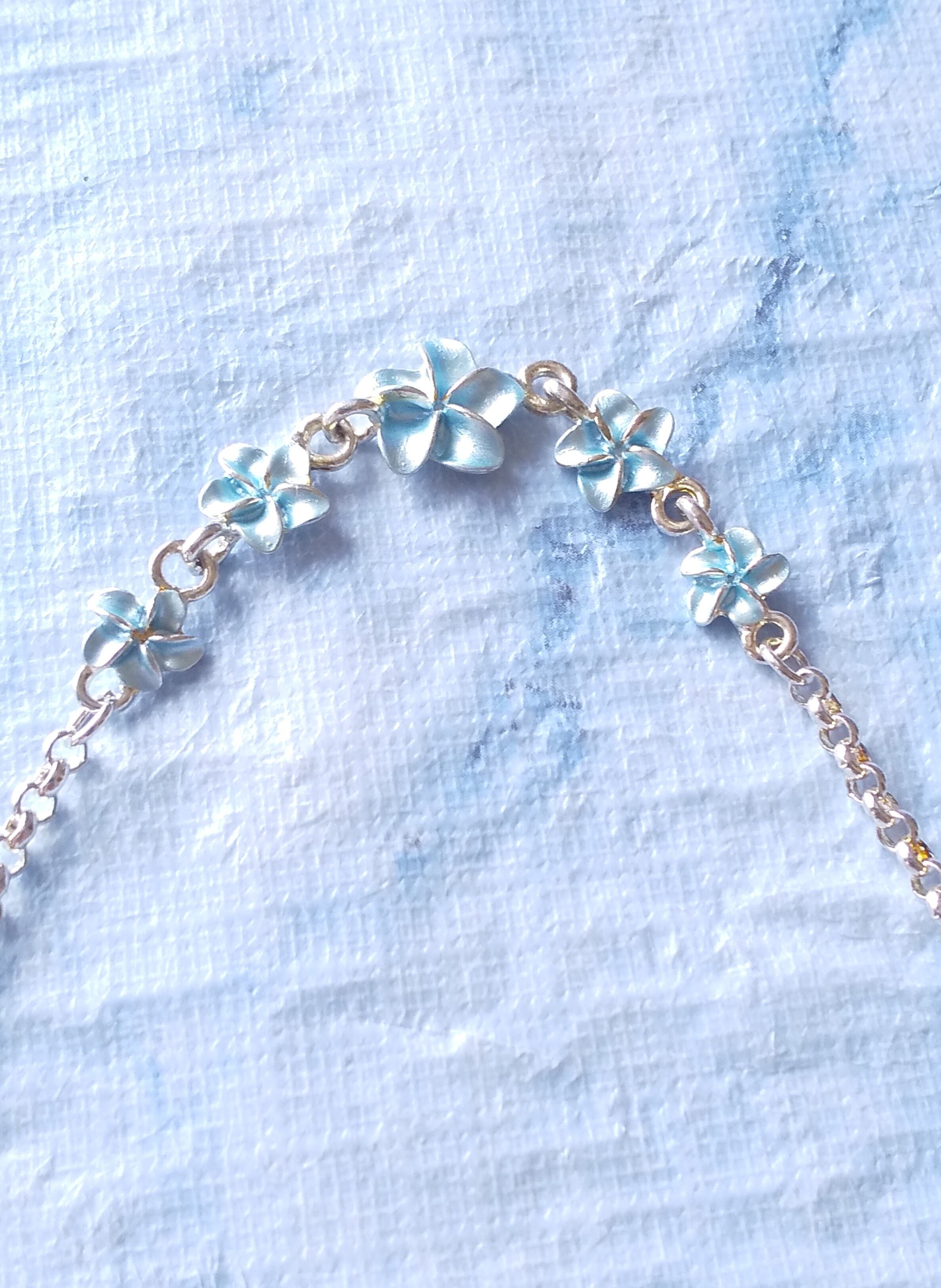 ハワイアンネックレス ライトブルー5連プルメリア&シルバーチェーン P-706