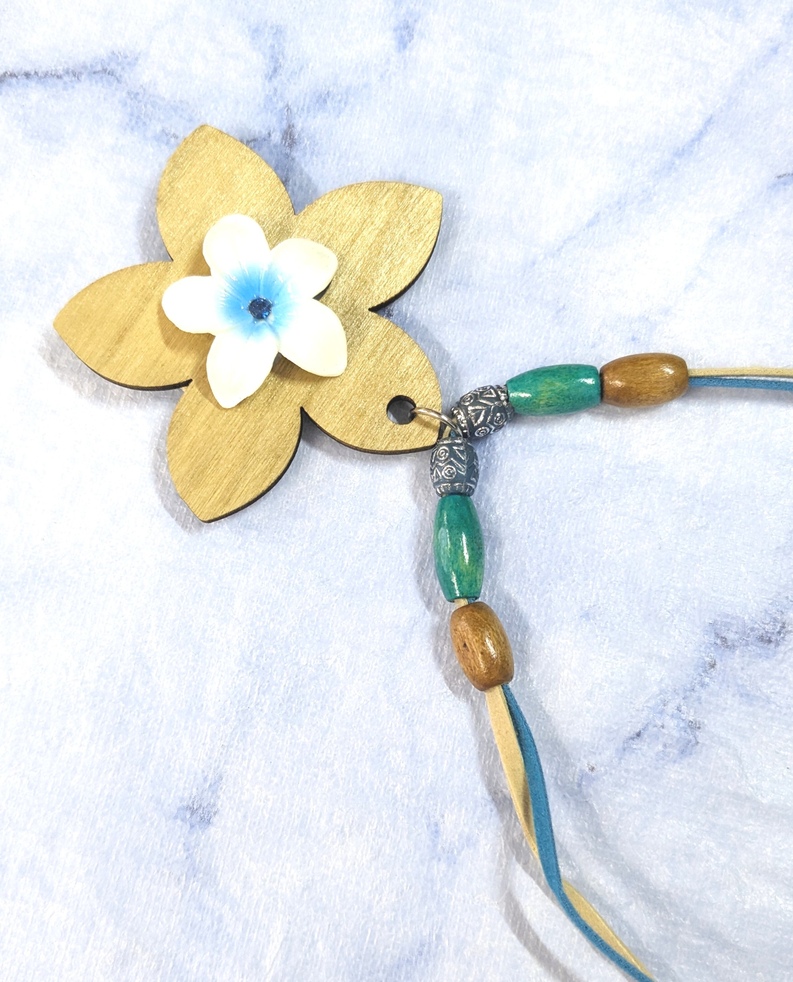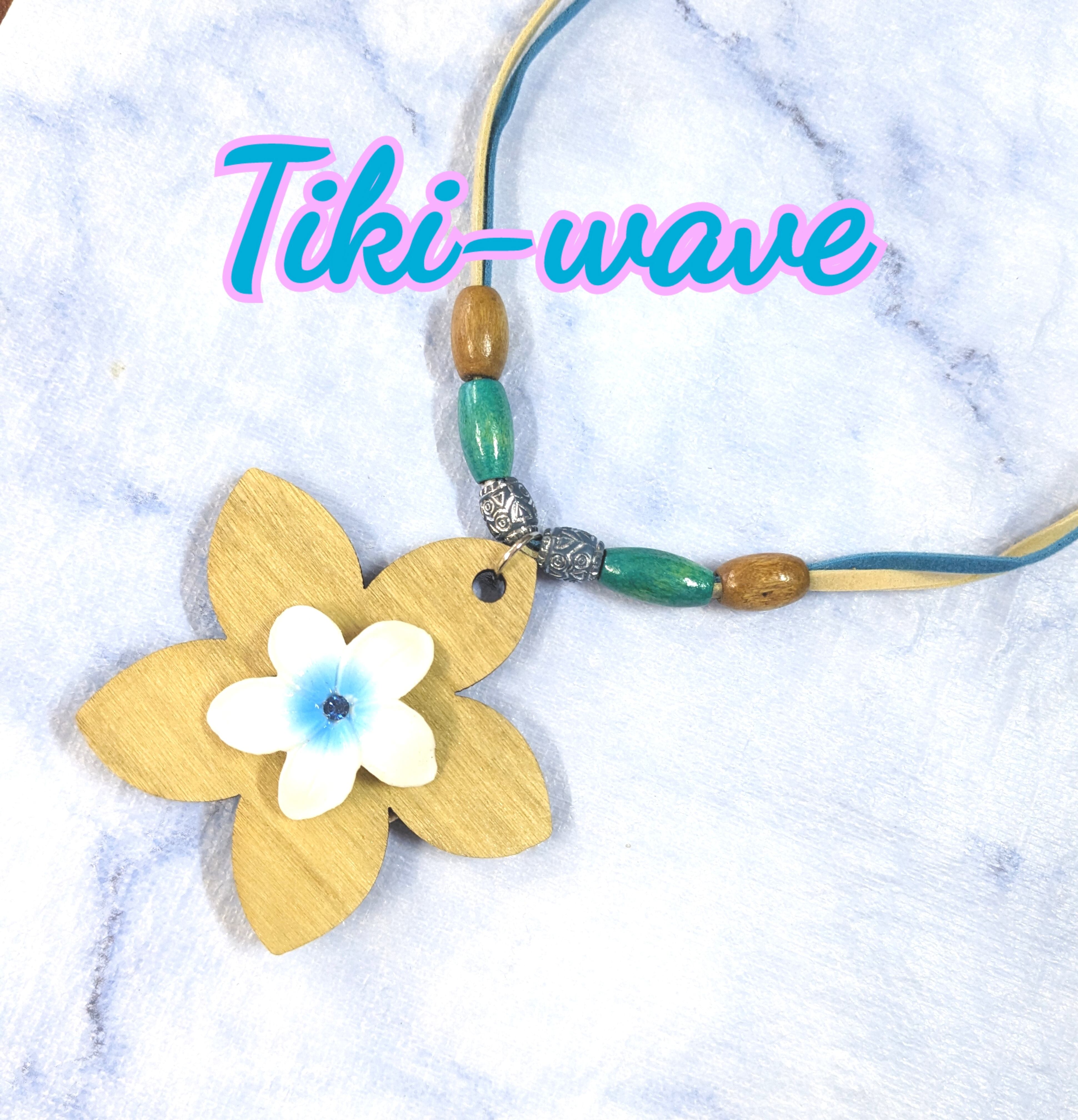 ハワイアンネックレス ブルー&ウッドプルメリア スエード P-730