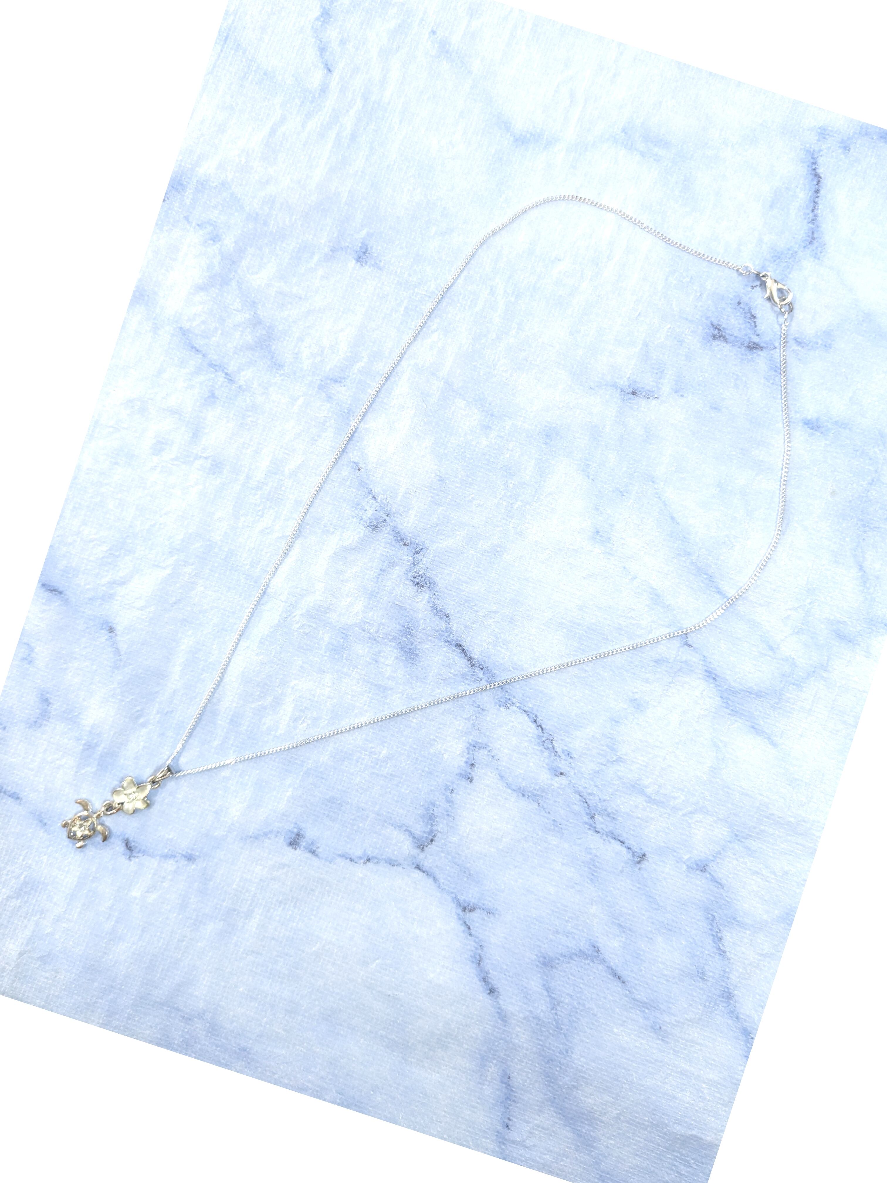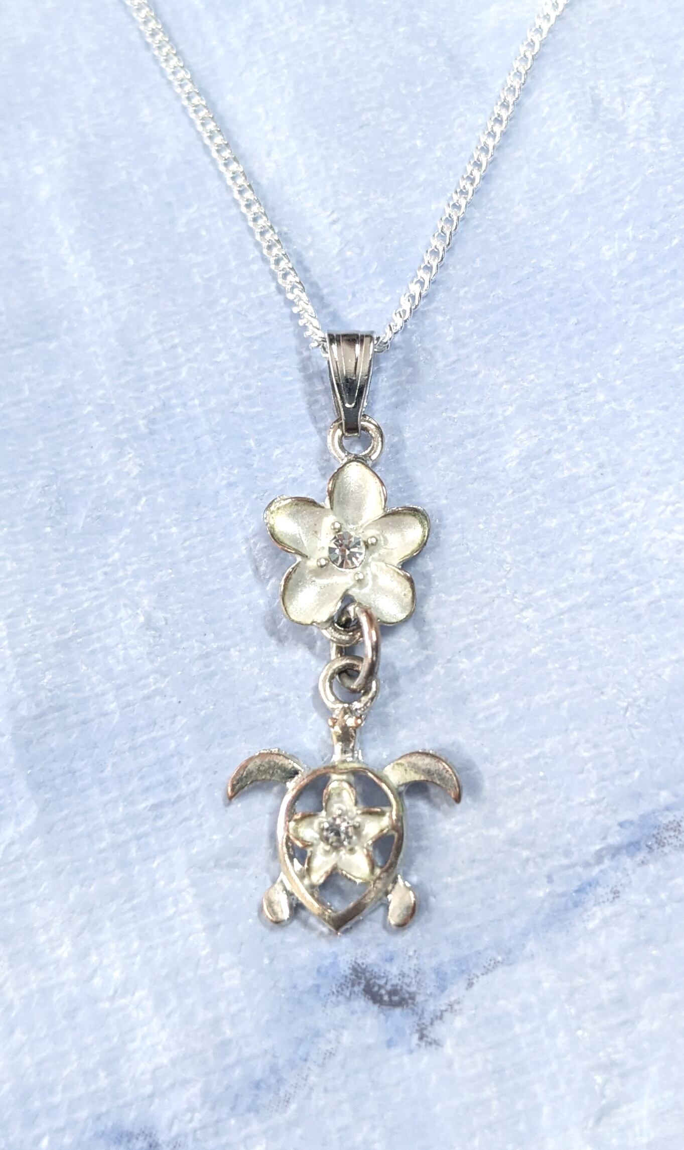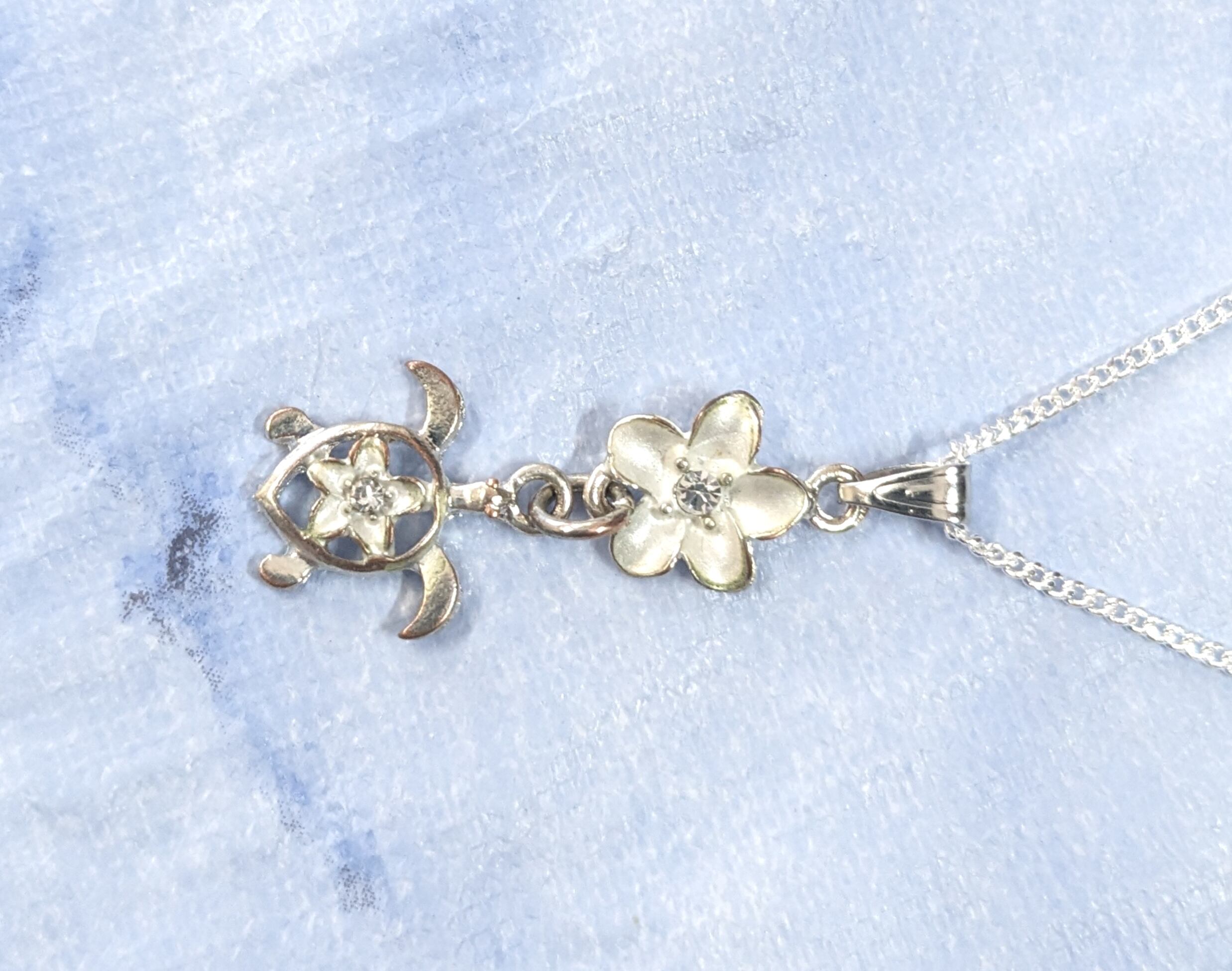 ハワイアンネックレス シルバーカラー CZ付き プルメリア&ホヌ H-188